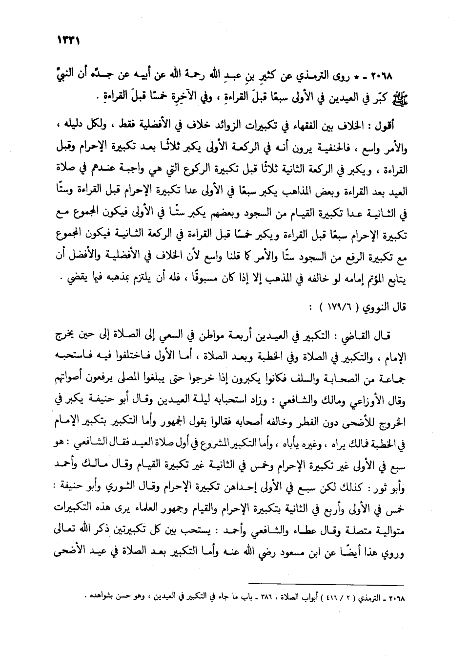 2068 - * روى الترمذي عن كثير بن عبد الله رحمه الله عن أبيه عن جده أن النبي صلى الله عليه وسلم كبر في العيدين في الأولى سبعاً قبل القراءة، وفي الآخرة خمساً قبل القراءة.