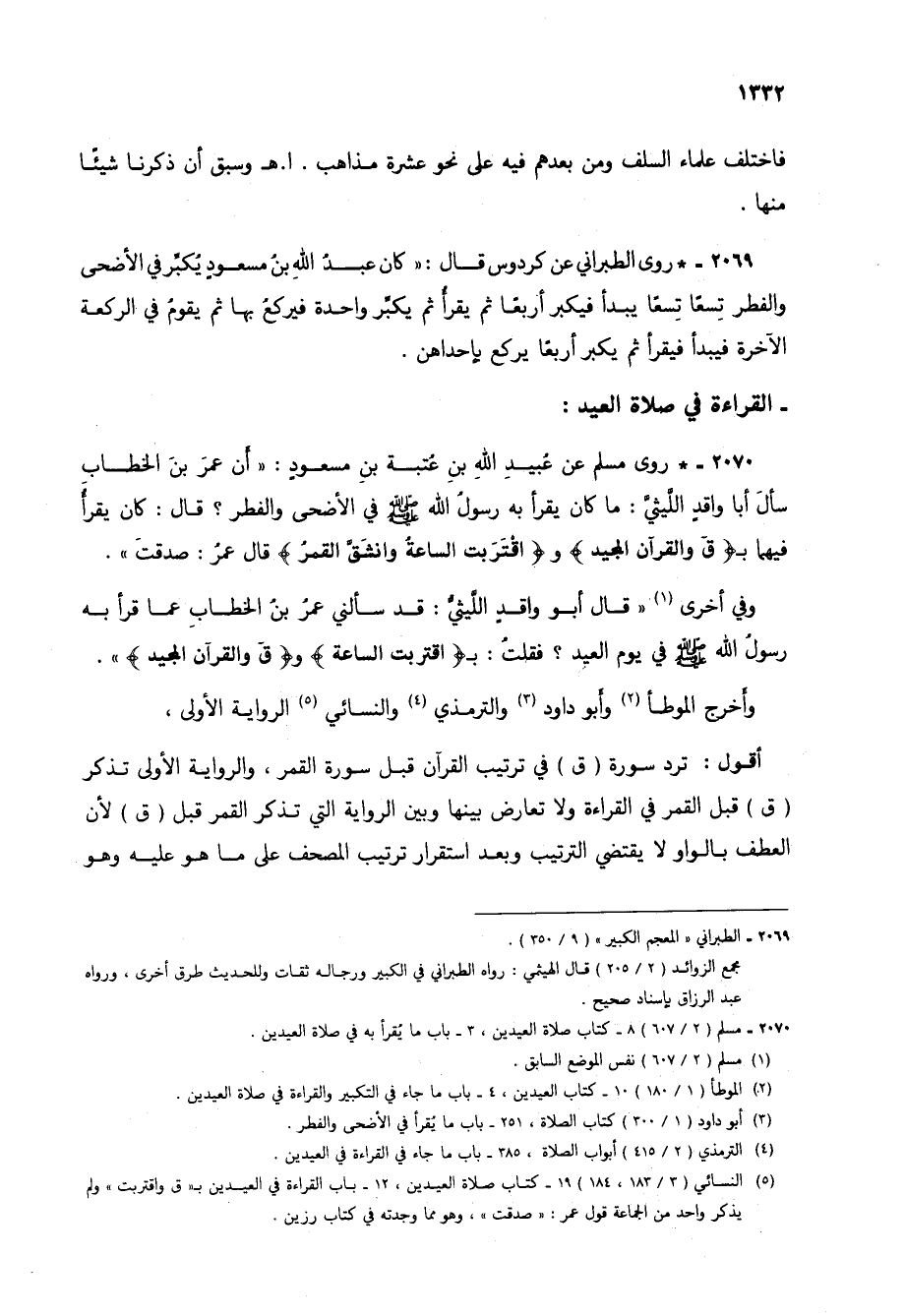 2069 - * روى الطبراني عن كردوس قال: "كان عبد الله بن مسعود يكبِّر في الأضحى والفطر تسعاً تسعاً يبدأ فيكبر أربعاً ثم يقرأ ثم يكبر واحدة فيركع بها ثم يقوم في الركعة الآخرة فيبدأ فيقرأ ثم يكبر أربعاً يركع بإحداهن.