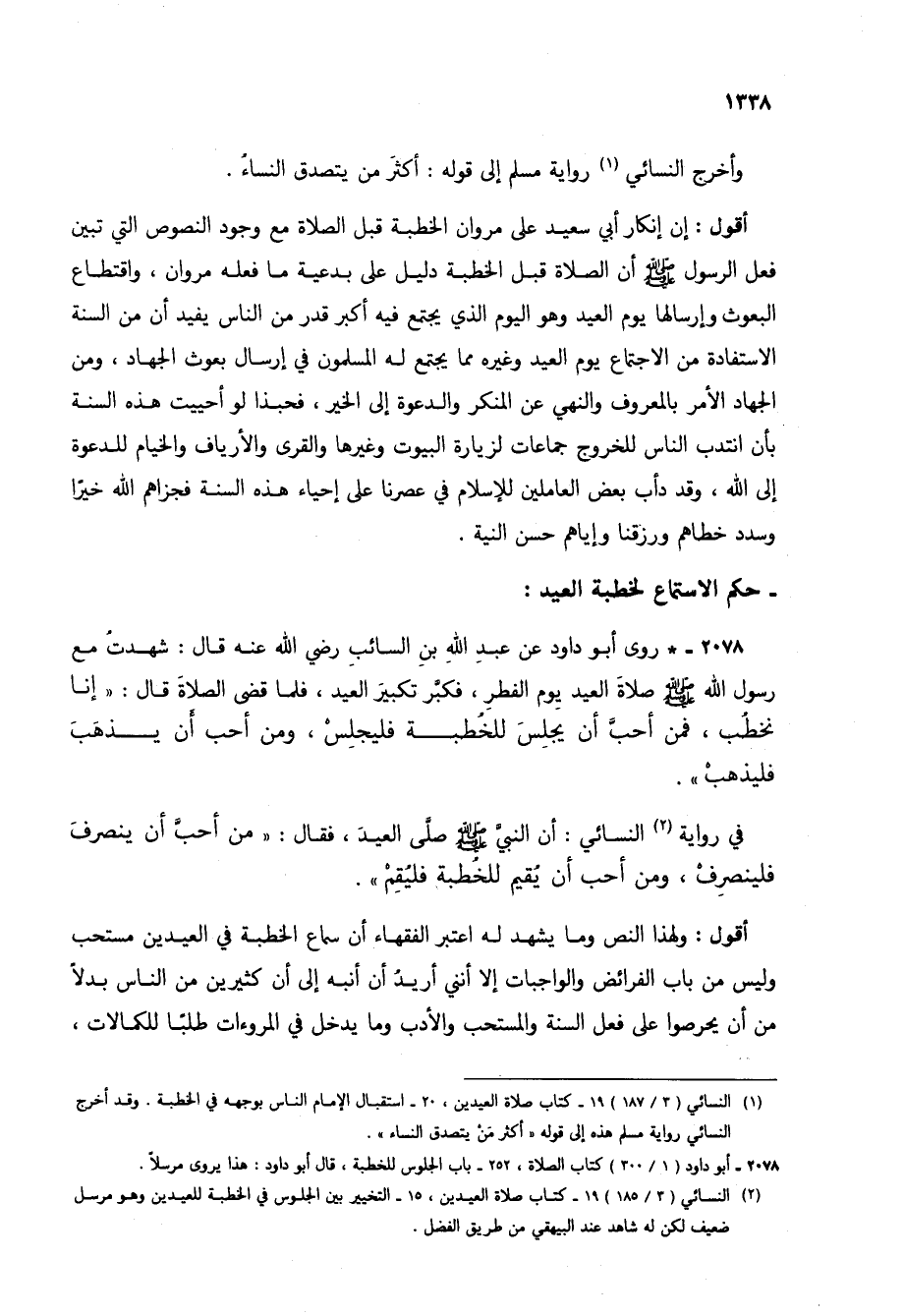 أقول: ولهذا النص وما يشهد له اعتبر الفقهاء أن سماع الخطبة في العيدين مستحب وليس من باب الفرائض والواجبات إلا أنني أريد أن أنبه إلى أن كثيرين من الناس بدلاً من أن يحرصوا على فعل السنة والمستحب والأدب وما يدخل في المروءات طلباً للكمالات،
