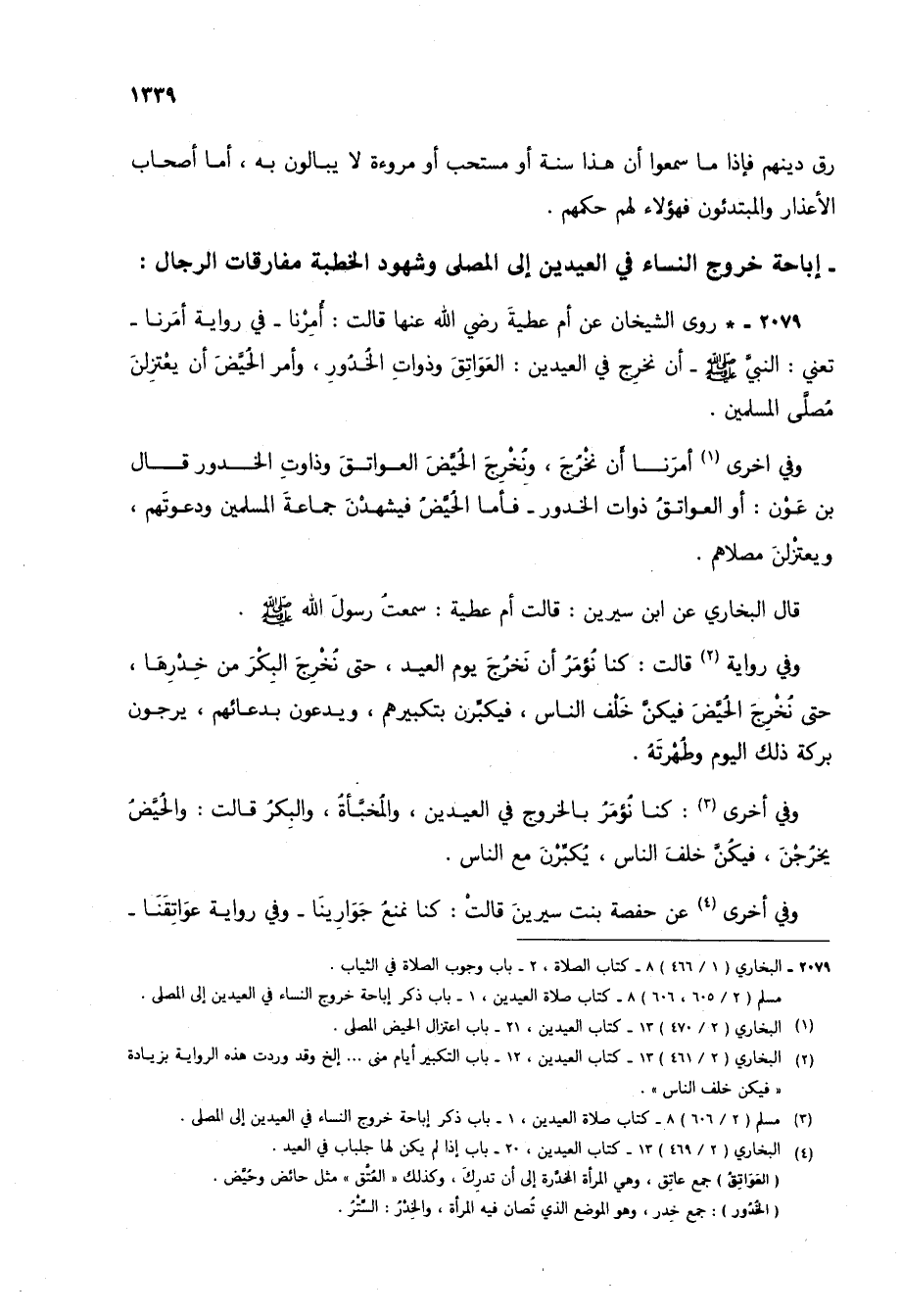 2079 - * روى الشيخان عن أم عطية رضي الله عنها قالت: أُمِرْنا- في رواية أمَرنا- تعني: النبي صلى الله عليه وسلم- أن نخرج في العيدين: العواتق وذوات الخدور، وأمر الحُيَّضَ أن يعتزلن مصلى المسلمين.