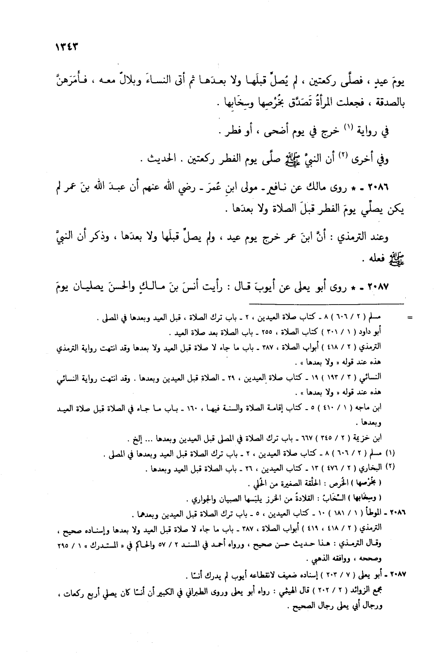 الترمذي (2/ 418، 419) أبواب الصلاة، 387 - باب ما جاء لا صلاة قبل العيد ولا بعدها وإسناده صحيح، وقال الترمذي: هذا حديث حسن صحيح، ورواه أحمد في المسند 2/ 57 والحاكم في "المستدرك" 1/ 295 وصححه، ووافقه الذهبي.