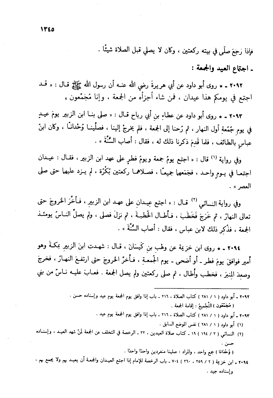 2092 - * روى أبو داود عن أبي هريرة رضي الله عنه أن رسول الله صلى الله عليه وسلم قال: "قد اجتمع في يومكم هذا عيدان، فمن شاء أجزأه من الجمعة، وإنا مجمعون".