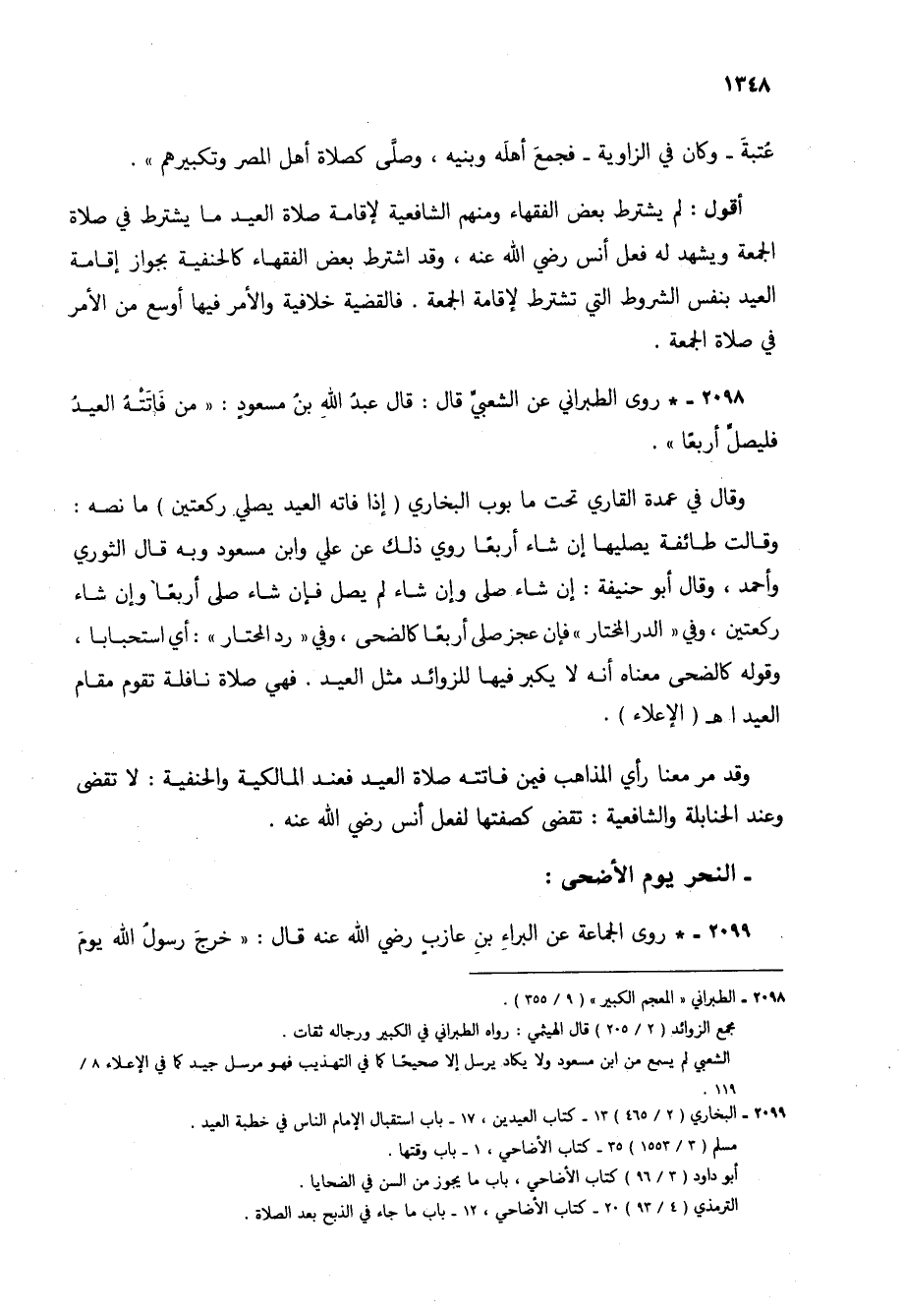2098 - * روى الطبراني عن الشعبي قال: قال عبد الله بن مسعود: "من فاتته العيد فليصل أربعاً".