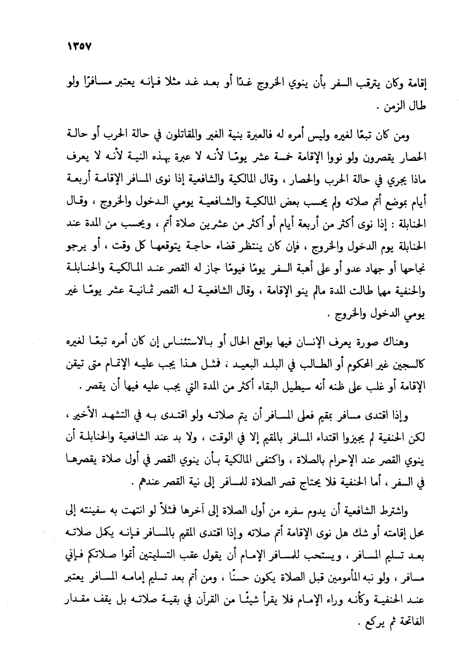 ومن كان تبعاً لغيره وليس أمره له فالعبرة بنية الغير والمقاتلون في حالة الحرب أو حالة الحصار يقصرون ولو نووا الإقامة خمسة عشر يوماً لأنه لا عبرة بهذه النية لأنه لا يعرف ماذا يجري في حالة الحرب والحصار، وقال المالكية والشافعية إذا نوى المسافر الإقامة أربعة أيام بموضع أتم صلاته ولم يحسب بعض المالكية والشافعية يومي الدخول والخروج، وقال الحنابلة: إذا نوى أكثر من أربعة أيام أو أكثر من عشرين صلاة أتم، ويحسب من المدة عند الحنابلة يوم الدخول والخروج، فإن كان ينتظر قضاء حاجة يتوقعها كل وقت، أو يرجو نجاحها أو جهاد عدو أو على أهبة السفر يوماً فيوماً جاز له القصر عند المالكية والحنابلة والحنفية مهما طالت المدة ما لم ينو الإقامة، وقال الشافعية له القصر ثمانية عشر يوماً غير يومي الدخول والخروج.