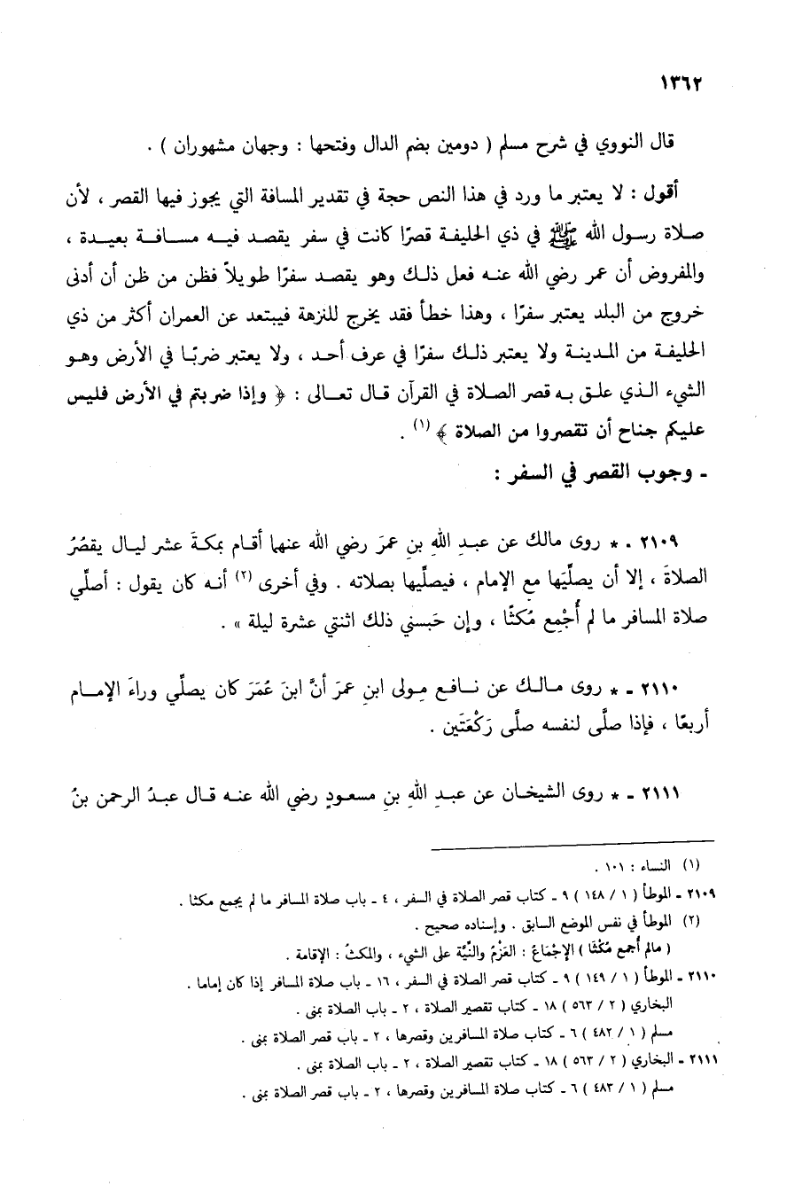 أقول: لا يعتبر ما ورد في هذا النص حجة في تقدير المسافة التي يجوز فيها القصر، لأن صلاة رسول الله صلى الله عليه وسلم في ذي الحليفة قصراً كانت في سفر يقصد فيه مسافة بعيدة، والمفروض أن عمر رضي الله عنه فعل ذلك وهو يقصد سفراً طويلاً فظن من ظن أن أدنى خروج من البلد يعتبر سفراً، وهذا خطأ فقد يخرج للنزهة فيبتعد عن العمران أكثر من ذي الحليفة من المدينة ولا يعتبر ذلك سفراً في عرف أحد، ولا يعتبر ضرباً في الأرض وهو الشيء الذي علق به قصر الصلاة في القرآن قال تعالى: {وَإِذَا ضَرَبْتُمْ فِي الْأَرْضِ فَلَيْسَ عَلَيْكُمْ جُنَاحٌ أَنْ تَقْصُرُوا مِنَ الصَّلَاةِ} (1).