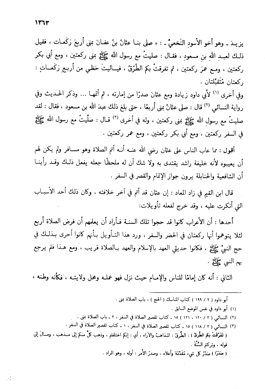 قال ابن القيم في زاد المعاد: إن عثمان قد أتم في آخر خلافته، وكان ذلك أحد الأسباب التي أنكرت عليه، وقد خرج لفعله تأويلات:
