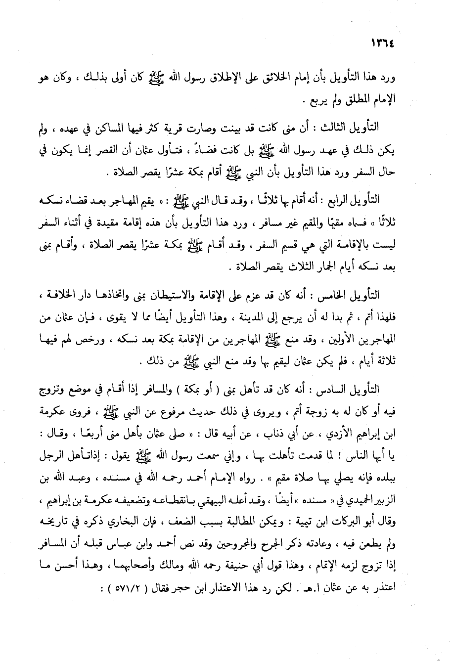 التأويل الخامس: أنه كان قد عزم على الإقامة والاستيطان بمنى واتخاذها دار الخلافة، فلهذا أتم، ثم بدا له أن يرجع إلى المدينة، وهذا التأويل أيضاً مما لا يقوى، فإن عثمان من المهاجرين الأولي، وقد منع صلى الله عليه وسلم المهاجرين من الإقامة بمكة بعد نسكه، ورخص لهم فيها ثلاثة أيام، فلم يكن عثمان ليقيم بها وقد منع النبي صلى الله عليه وسلم من ذلك.