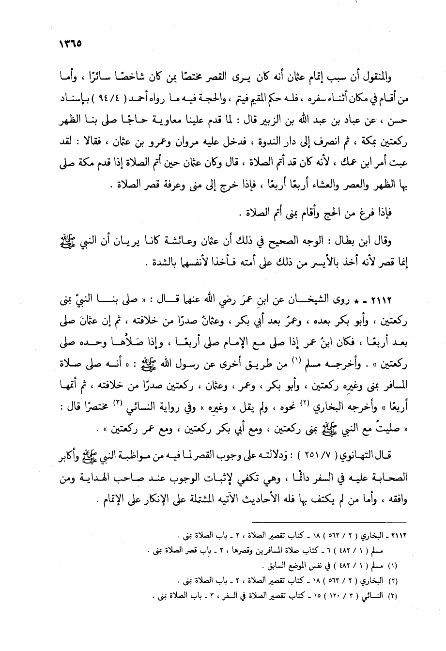 2112 - * روى الشيخان عن ابن عمر رضي الله عنهما قال: "صلى بنا النبي بمنى ركعتين، وأبو بكر بعده، وعمر بعد أبي بكر، وعثمان صدراً من خلافته، ثم ن عثمان صلى بعد أربعاً، فكان ابن عمر إذا صلى مع الإمام صلى أربعاً، وإذا صلاها وحده صلى ركعتين". وأخرجه مسلم (1) من طريق أخرى عن رسول الله صلى الله عليه وسلم: "أنه صلى صلاة المسافر بمنى وغيره ركعتين، وأبو بكر، وعمر، وعثمان، ركعتين صدراً من خلافته، ثم أتمها أربعاً" وأخرجه البخاري (2) نحوه، ولم يقل "وغيره" وفي رواية النسائي (3) مختصراً قال: "صليت مع النبي صلى الله عليه وسلم بمنى ركعتين، ومع أبي بكر ركعتين، ومع عمر ركعتين".