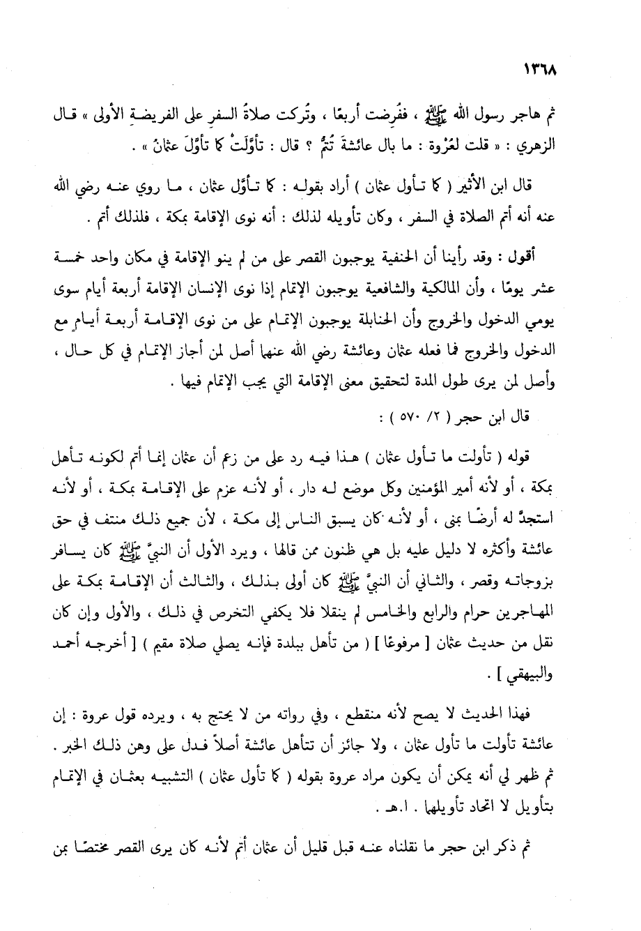 فهذا الحديث لا يصح لأنه منقطع، وفي رواته من لا يحتج به، ويرده قول عروة: إن عائشة تأولت ما تأول عثمان، ولا جائز أن تتأهل عائشة أصلاً فدل على وهن ذلك الخبر. ثم ظهر لي أنه يمكن أن يكون مراد عروة بقوله (كما تأول عثمان) التشبيه بعثمان في الإتمام بتأويل لا اتحاد تأويلهما. ا. هـ.