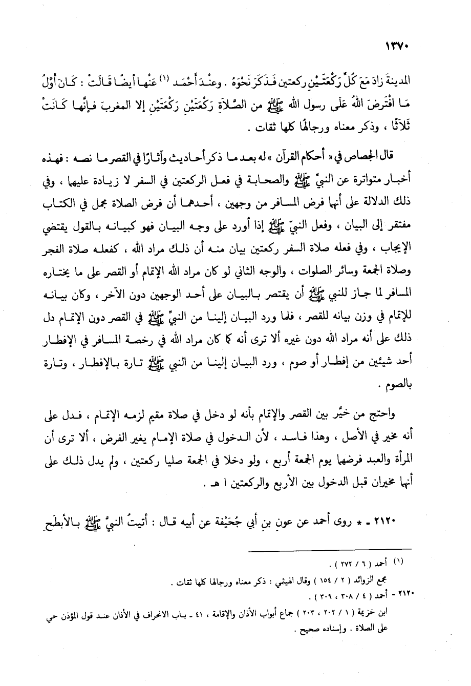 قال الجصاص في "أحكام القرآن" له بعدما ذكر أحاديث وآثاراً في القصر ما نصه: فهذه أخبار متواترة عن النبي صلى الله عليه وسلم والصحابة في فعل الركعتين في السفر لا زيادة عليهما، وفي ذلك الدلالة على أنهما فرض المسافر من وجهين، أحدهما أن فرض الصلاة مجمل في الكتاب مفتقر إلى البيان، وفعل النبي صلى الله عليه وسلم إذا أورد على وجه البيان فهو كبيانه بالقول يقتضي الإيجاب، وفي فعله صلاة السفر ركعتين بيان منه أن ذلك مراد الله، كفعله صلاة الفجر وصلاة الجمعة وسائر الصلوات، والوجه الثاني لو كان مراد الله الإتمام أو القصر على ما يختاره المسافر لما جاز للنبي صلى الله عليه وسلم أن يقتصر بالبيان على أحد الوجهين دون الآخر، وكان بيانه للإتمام في وزن بيانه للقصر، فلما ورد البيان إلينا من النبي صلى الله عليه وسلم في القصر دون الإتمام دل ذلك على أنه مراد الله دون غيره ألا ترى أنه كما كان مراد الله في رخصة المسافر في الإفطار أحد شيئين من إفطار أو صوم، ورد البيان إلينا من النبي صلى الله عليه وسلم تارة بالإفطار، وتارة بالصوم.