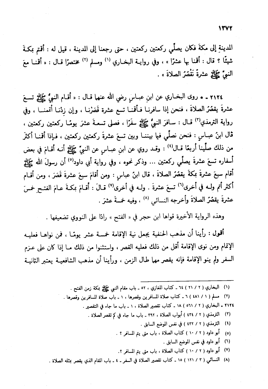 2124 - * روى البخاري عن ابن عباس رضي الله عنهما قال: "أقام النبي صلى الله عليه وسلم تسع عشرة يقصر الصلاة، فنحن إذا سافرنا فأقمنا تسع عشرة قصرنا، وإن زدنا أتممنا، وفي رواية الترمذي (3) قال: سافر النبي صلى الله عليه وسلم سفراً، فصلى تسعة عشر يوماً ركعتين ركعتين، قال ابن عباس: فنحن نصلي فيما بيننا وبين تسع عشرة ركعتين ركعتين، فإذا أقمنا أكثر من ذلك صلينا أربعاً قال (4): وقد روي عن ابن عباس عن النبي صلى الله عليه وسلم أنه أقام في بعض أسفاره تسع عشرة يصلي ركعتين ... وذكر نحوه، وفي رواية أبي داود (5) أن رسول الله صلى الله عليه وسلم أقام سبع عشرة بمكة يقصر الصلاة، قال ابن عباس: ومن أقام سبع عشرة قصر، ومن أقام أكثر أتم وله في أخرى (6) تسع عشرة. وله في أخرى (7) قال: أقام بمكة عام الفتح خمس عشرة يقصر الصلاة وأخرجه النسائي (8)، وفيه خمسة عشر.