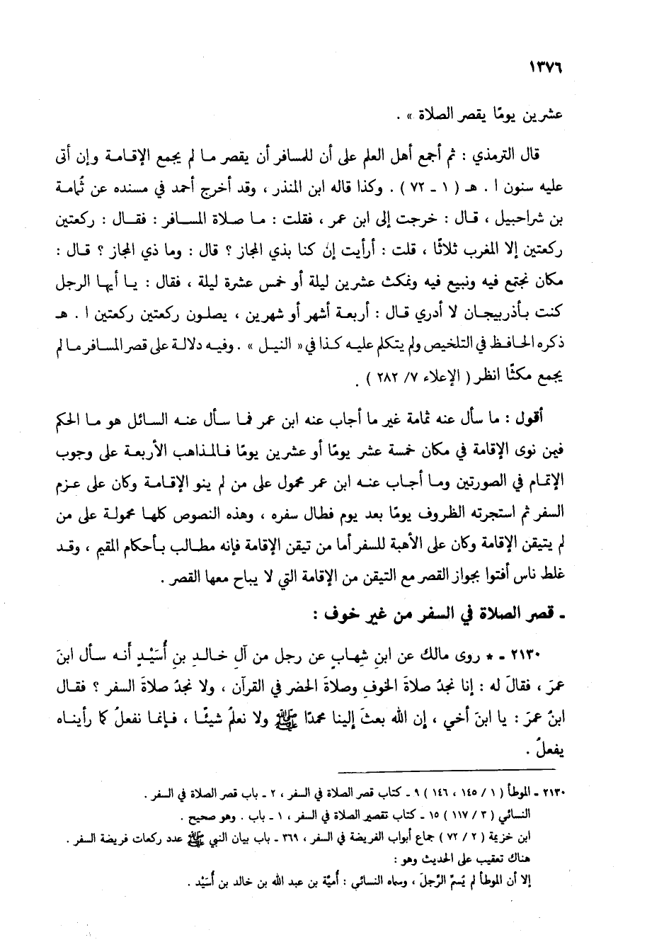 أقول: ما سأل عنه ثمامة غير ما أجاب عنه ابن عمر فما سأل عنه السائل هو ما الحكم فيمن نوى الإقامة في مكان خمسة عشر يوماً أو عشرين يوماً فالمذاهب الأربعة على وجوب الإتمام في الصورتين وما أجاب عنه ابن عمر محمول على من لم ينو الإقامة وكان على عزم السفر ثم استجرته الظروف يوماً بعد يوم فطال سفره، وهذه النصوص كلها محمولة على من لم يتيقن الإقامة وكان على الأهبة للسفر أما من تيقن الإقامة فإنه مطالب بأحكام المقيم، وقد غلط ناس أفتوا بجواز القصر مع التيقن من الإقامة التي لا يباح معها القصر.