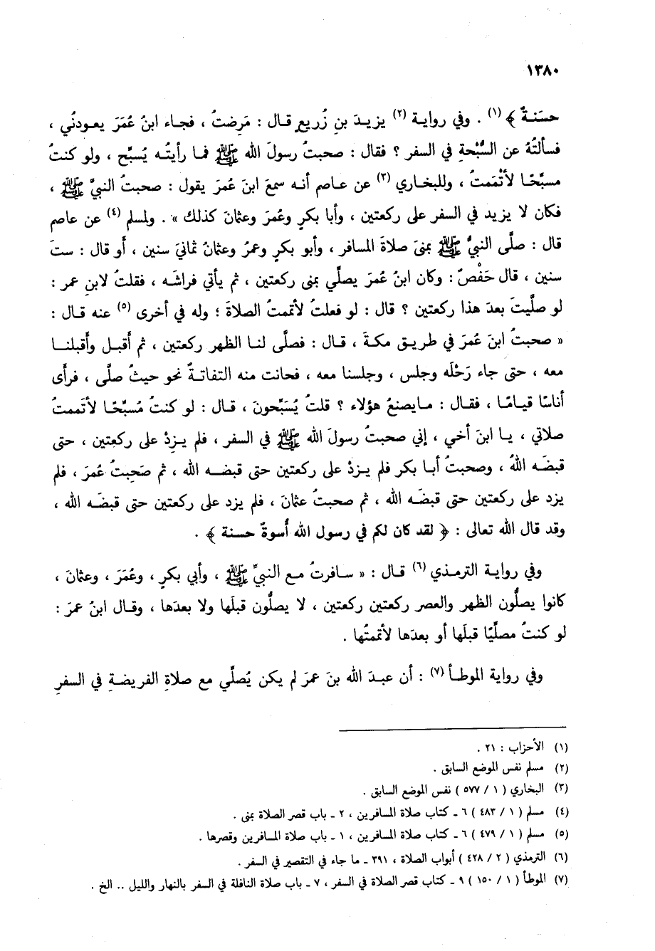 حَسَنَةٌ} (1). وفي رواية (2) يزيد بن زريع قال: مرضت، فجاء ابن عمر يعودني، فسألته عن السبحة في السفر؟ فقال: صحبت رسول الله صلى الله عليه وسلم فما رأيته يسبح، ولو كنت مسبحاً لأتممت، وللبخاري (3) عن عاصم أنه سمع ابن عمر يقول: صحبت النبي صلى الله عليه وسلم، فكان لا يزيد في السفر على ركعتين، وأبا بكر وعمر وعثمان كذلك". ولمسلم (4) عن عاصم قال: صلى النبي صلى الله عليه وسلم بمنى صلاة المسافر، وأبو بكر وعمر وعثمان ثماني سنين، أو قال: ست سنين، قال حفص: وكان ابن عمر يصلي بمنى ركعتين، ثم يأتي فراشه، فقلت لابن عمر: لو صليت بعد هذا ركعتين؟ قال: لو فعلت لأتممت الصلاة؛ وله في أخرى (5) عنه قال: "صحبت ابن عمر في طريق مكة، قال: فصلى لنا الظهر ركعتين، ثم أقبل وأقبلنا معه، حتى جاء رحله وجلس، وجلسنا معه، فحانت منه التفاتة نحو حيث صلى، فرأى أناساً قياماً، فقال: ما يصنع هؤلاء؟ قلت يسبحون، قال: لو كنت مسبحاً لأتممت صلاتي، يا ابن أخي، إني صحبت رسول الله صلى الله عليه وسلم في السفر، فلم يزد على ركعتين، حتى قبضه الله، وصحبت أبا بكر فلم يزد على ركعتين حتى قبضه الله، ثم صحبت عمر، فلم يزد على ركعتين حتى قبضه الله، ثم صحبت عثمان، فلم يزد على ركعتين حتى قبضه الله، وقد قال الله تعالى: {لَقَدْ كَانَ لَكُمْ فِي رَسُولِ اللَّهِ أُسْوَةٌ حَسَنَةٌ}.