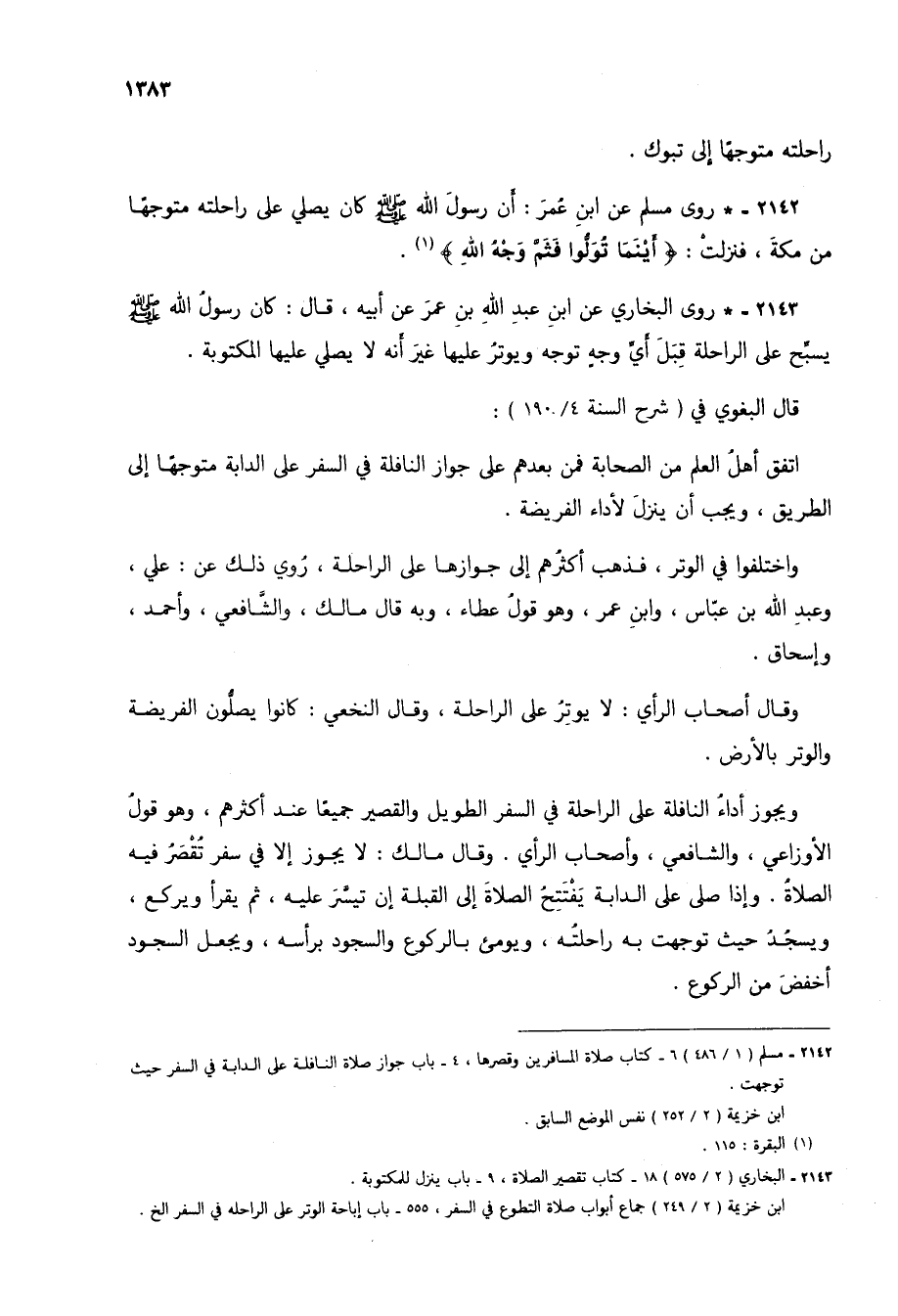 2143 - * روى البخاري عن ابن عبد الله بن عمر عن أبيه، قال: كان رسول الله صلى الله عليه وسلم يسبح على الراحلة قبل أي وجه توجه ويوتر عليها غير أنه لا يصلي عليها المكتوبة.