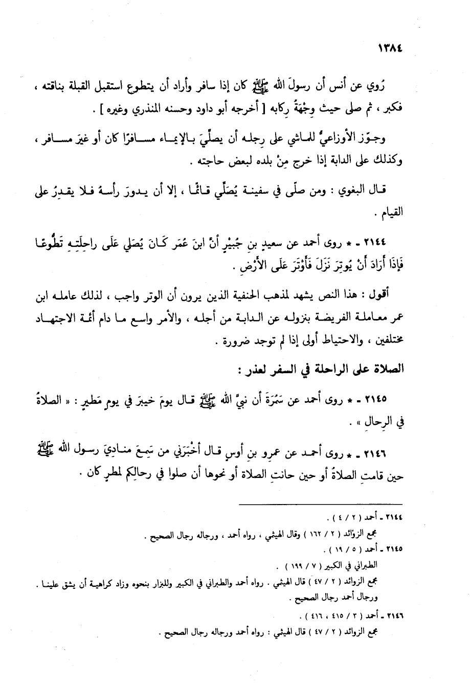 2144 - * روى أحمد عن سعيد بن جبير أن ابن عمر كان يصلي على راحلته تطوعاً فإذا أراد أن يوتر نزل فأوتر على الأرض.