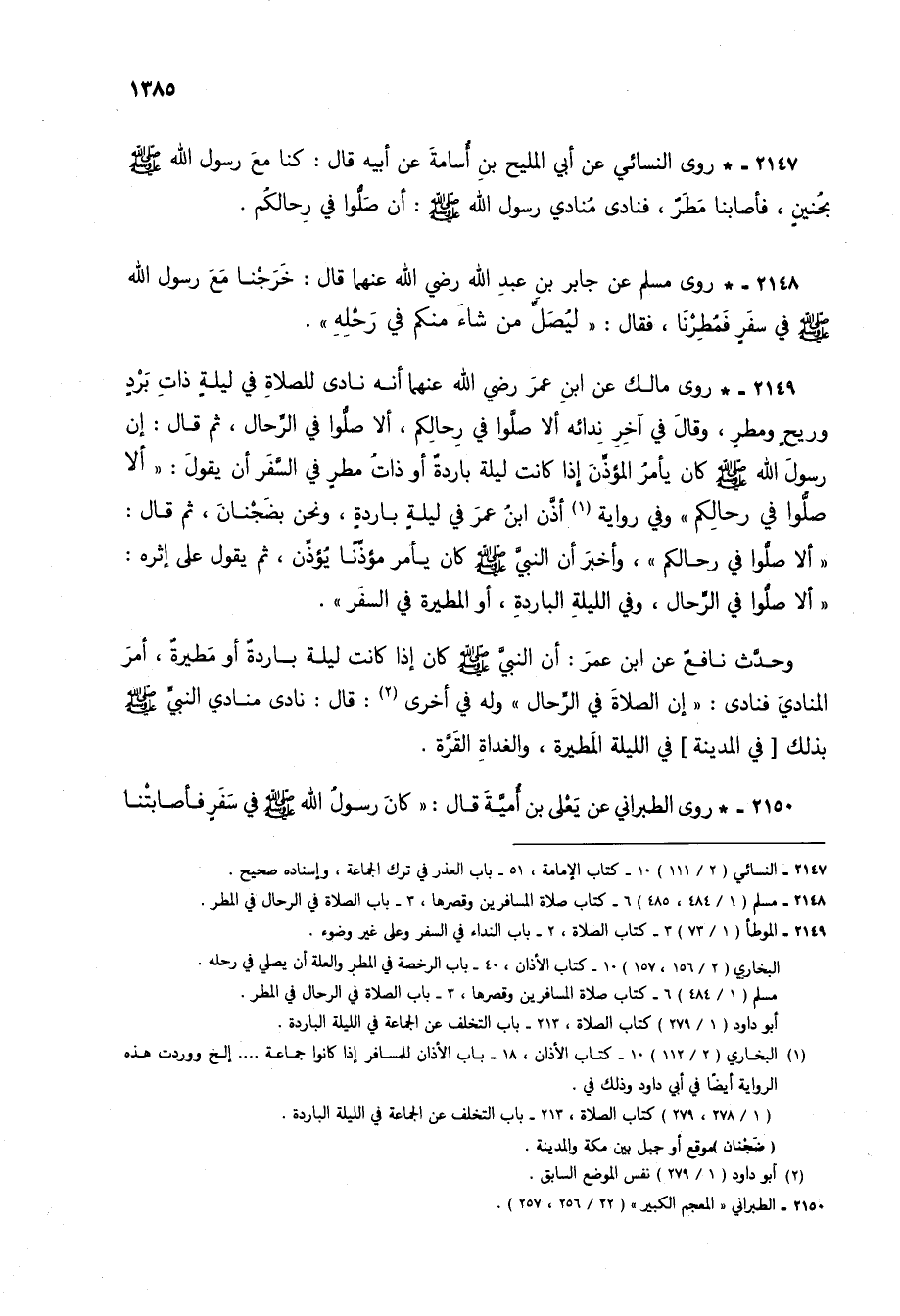 2147 - * روى النسائي عن أبي المليح بن أسامة عن أبيه قال: كنا مع رسول الله صلى الله عليه وسلم بحنين، فأصابنا مطر، فنادى منادي رسول الله صلى الله عليه وسلم: أن صلوا في رحالكم.