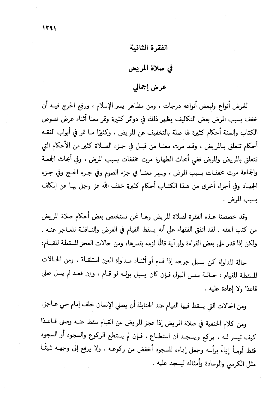 وقد خصصنا هذه الفقرة لصلاة المريض وها نحن نستخلص بعض أحكام صلاة المريض من كتب الفقه. لقد اتفق الفقهاء على أنه يسقط القيام في الفرض والنافلة للعاجز عنه. ولكن إذا قدر على بعض القراءة ولو آية قائماً لزمه بقدرها، ومن حالات العجز المسقطة للقيام: