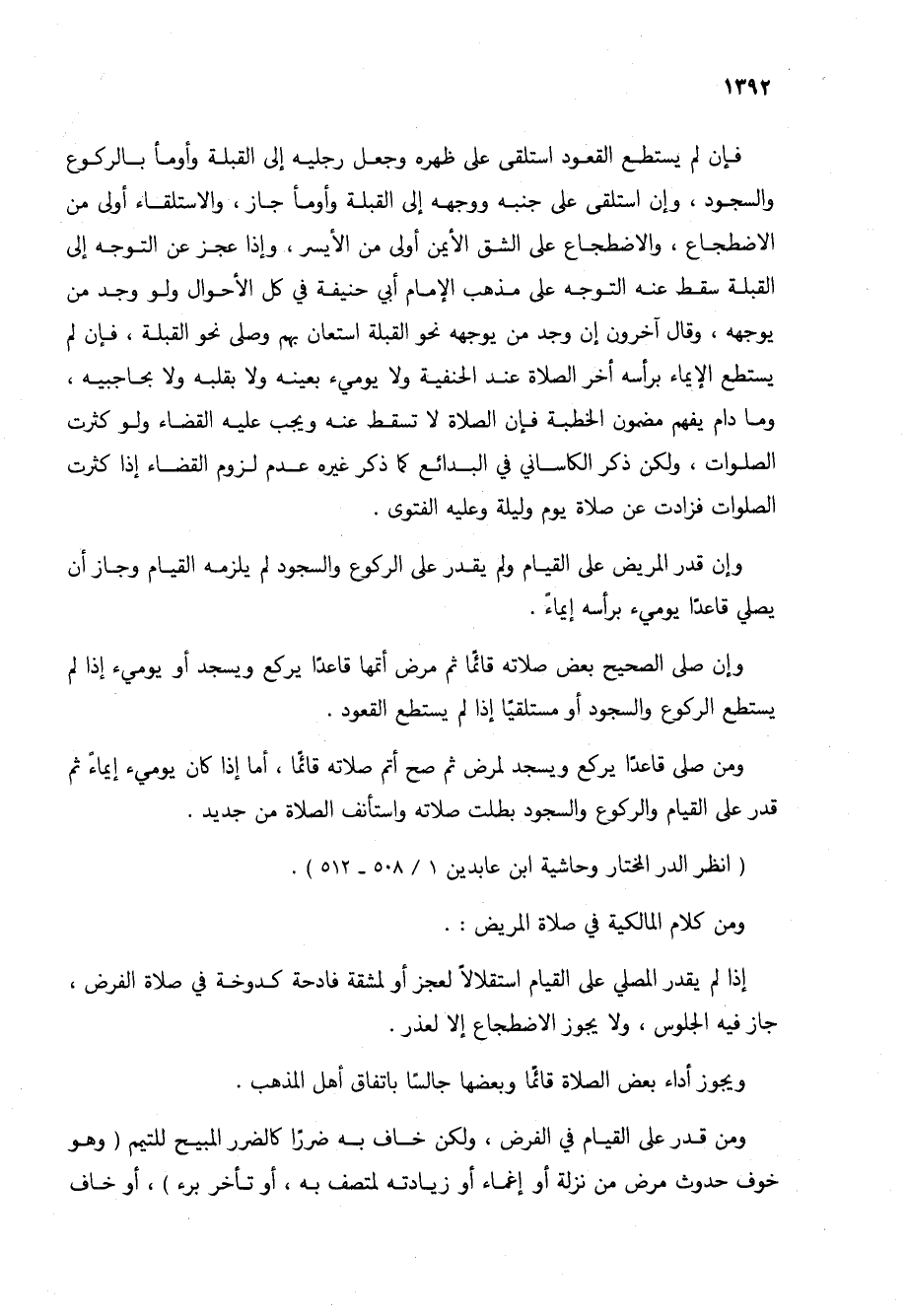 فإن لم يستطع القعود استلقى على ظهره وجعل رجليه إلى القبلة وأومأ بالركوع والسجود، وإن استلقى على جنبه ووجهه إلى القبلة وأومأ جاز، والاستلقاء أولى من الاضطجاع، والاضطجاع على الشق الأيمن أولى من الأيسر، وإذا عجز عن التوجه إلى القبلة سقط عنه التوجه على مذهب الإمام أبي حنيفة في كل الأحوال ولو وجد من يوجهه، وقال آخرون إن وجد من يوجهه نحو القبلة استعان بهم وصلى نحو القبلة، فإن لم يستطع الإيماء برأسه أخر الصلاة عند الحنفية ولا يومئ بعينه ولا بقلبه ولا بحاجبيه، وما دام يفهم مضمون الخطبة فإن الصلاة لا تسقط عنه ويجب عليه القضاء ولو كثرت الصلوات، ولكن ذكر الكاساني في البدائع كما ذكر غيره عدم لزوم القضاء إذا كثرت الصلوات فزادت عن صلاة يوم وليلة وعليه الفتوى.