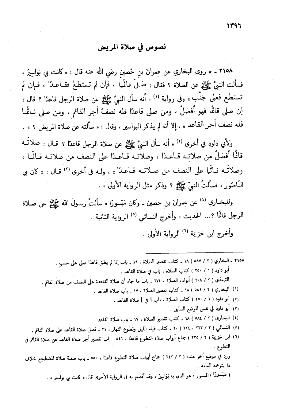 2158 - * روى البخاري عن عمران بن حصين رضي الله عنه قال: "كانت بي بواسير، فسألت النبي صلى الله عليه وسلم عن الصلاة؟ فقال: صل قائماً، فإن لم تستطع فقاعداً، فإن لم تستطع فعلى جنب" وفي رواية (1) "أنه سأل النبي صلى الله عليه وسلم عن صلاة الرجل قاعداً؟ قال: إن صلى قائماً فهو أفضل، ومن صلى قاعداً فله نصف أجر القائم، ومن صلى نائماً فله نصف أجر القاعد"، إلا أنه لم يذكر البواسير، وقال: "سألته عن صلاة المريض؟ ".