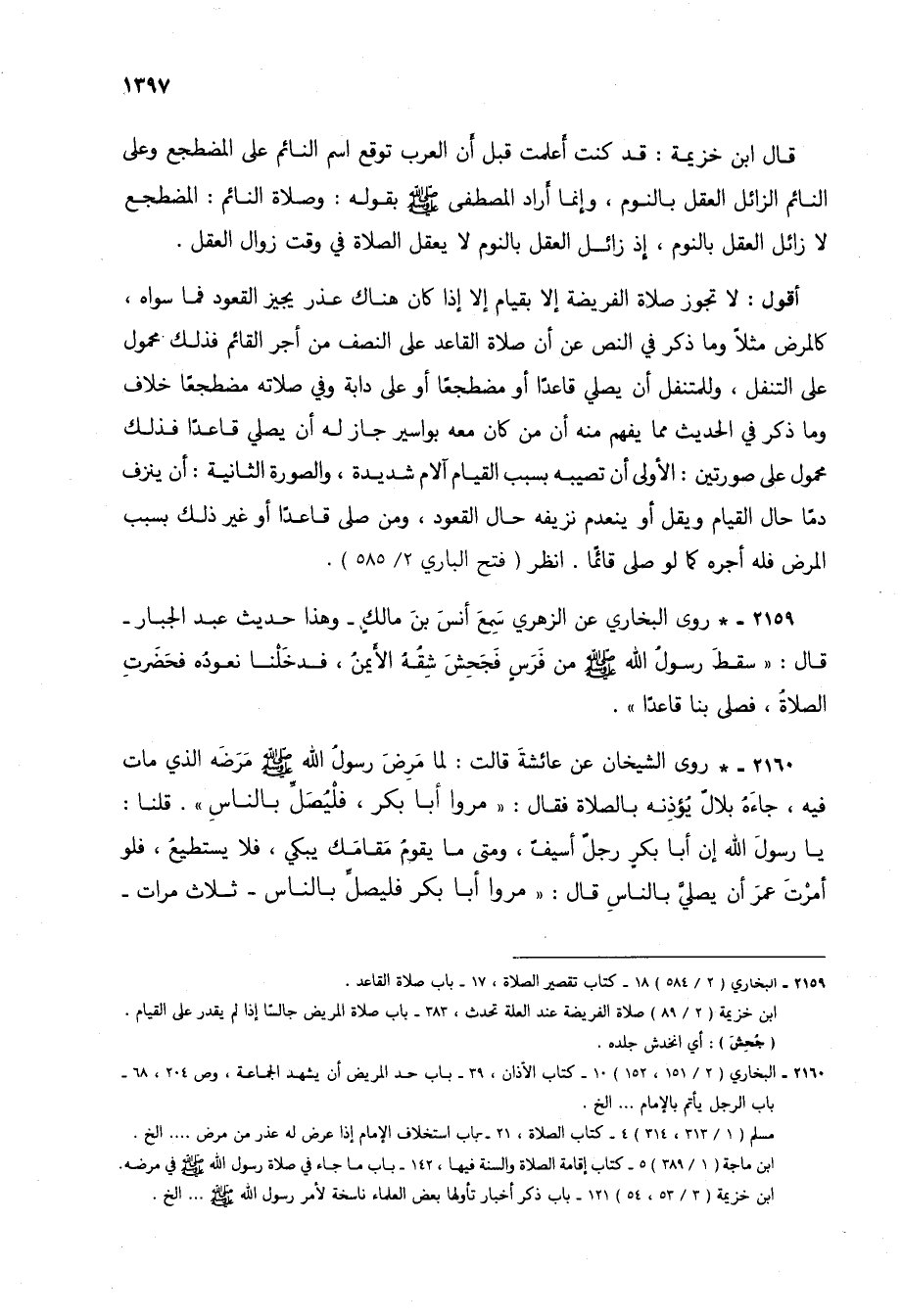 2159 - * روى البخاري عن الزهري سمع أنس بن مالك- وهذا حديث عبد الجبار- قال: "سقط رسول الله صلى الله عليه وسلم من فرس فجحش شقه الأيمن، فدخلنا نعوده فحضرت الصلاة، فصلى بنا قاعداً".
