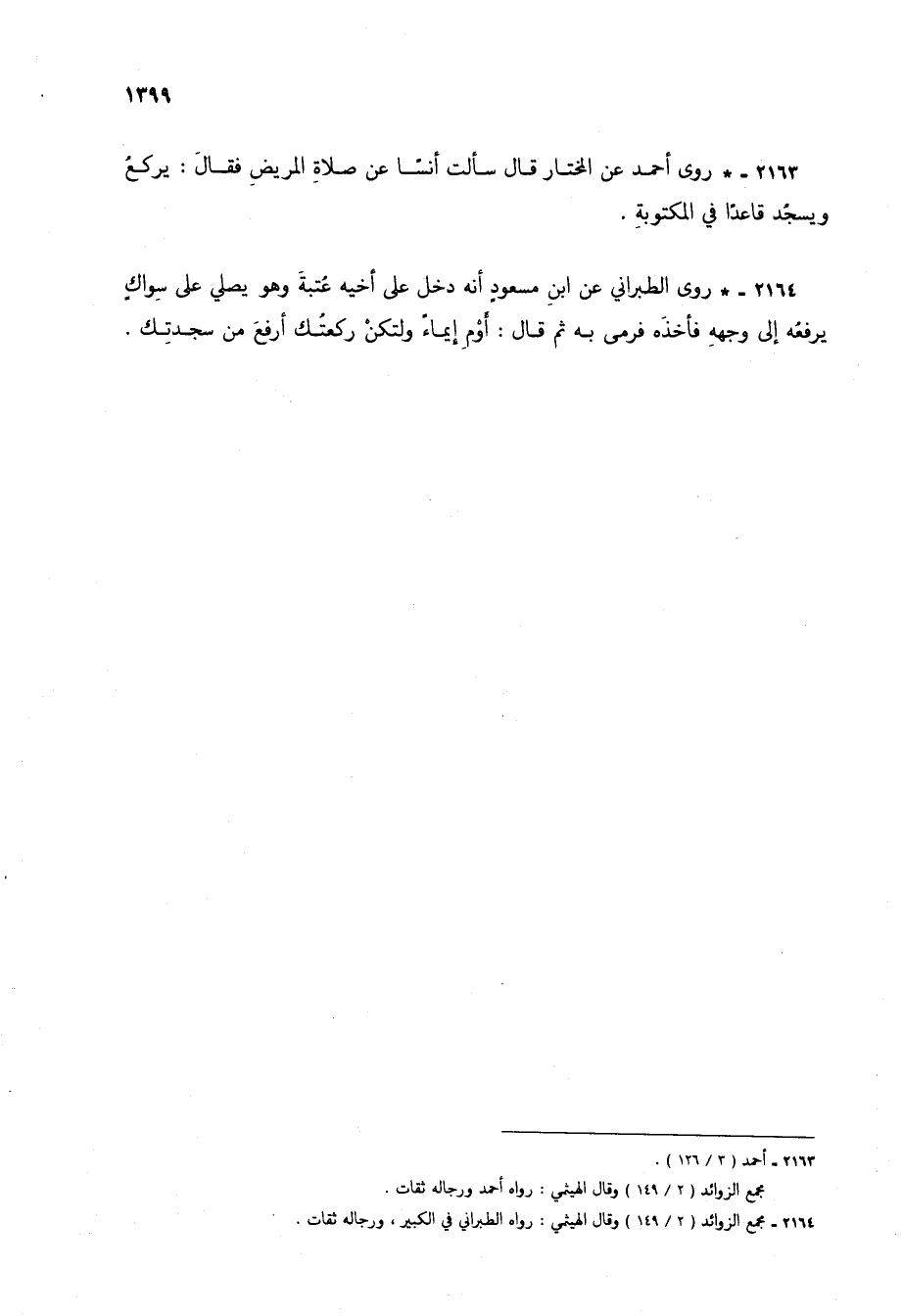 2164 - * روى الطبراني عن ابن مسعود أنه دخل على أخيه عتبة وهو يصلي على سواك يرفعه إلى وجهه فأخذه فرمى به ثم قال: أوم إيماءً ولتكن ركعتك أرفع من سجدتك.
