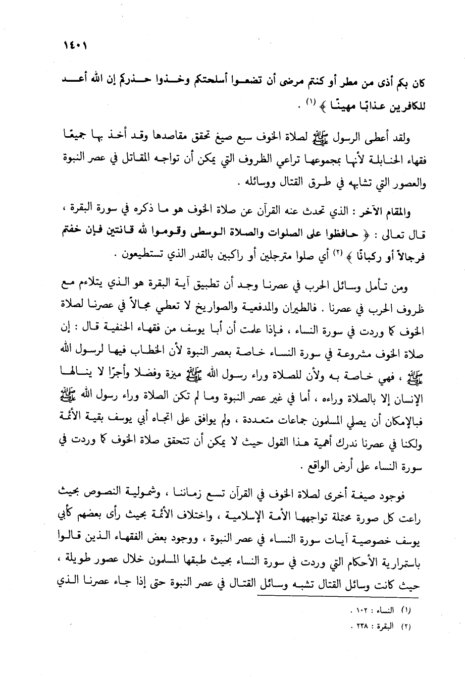ومن تأمل وسائل الحرب في عصرنا وجد أن تطبيق آية البقرة هو الذي يتلاءم مع ظروف الحرب في عصرنا. فالطيران والمدفعية والصواريخ لا تعطي مجالاً في عصرنا لصلاة الخوف كما وردت في سورة النساء، فإذا علمت أن أبا يوسف من فقهاء الحنفية قال: إن صلاة الخوف مشروعة في سورة النساء خاصة بعصر النبوة لأن الخطاب فيها لرسول الله صلى الله عليه وسلم، فهي خاصة به ولأن للصلاة وراء رسول الله صلى الله عليه وسلم ميزة وفضلاً وأجراً لا ينالها الإنسان إلا بالصلاة وراءه، أما في غير عصر النبوة وما لم تكن الصلاة وراء رسول الله صلى الله عليه وسلم بالإمكان أني صلي المسلمون جماعات متعددة، ولم يوافق على اتجاه أبي يوسف بقية الأئمة ولكنا في عصرنا ندرك أهمية هذا القول حيث لا يمكن أن تتحقق صلاة الخوف كما وردت في سورة النساء على أرض الواقع.