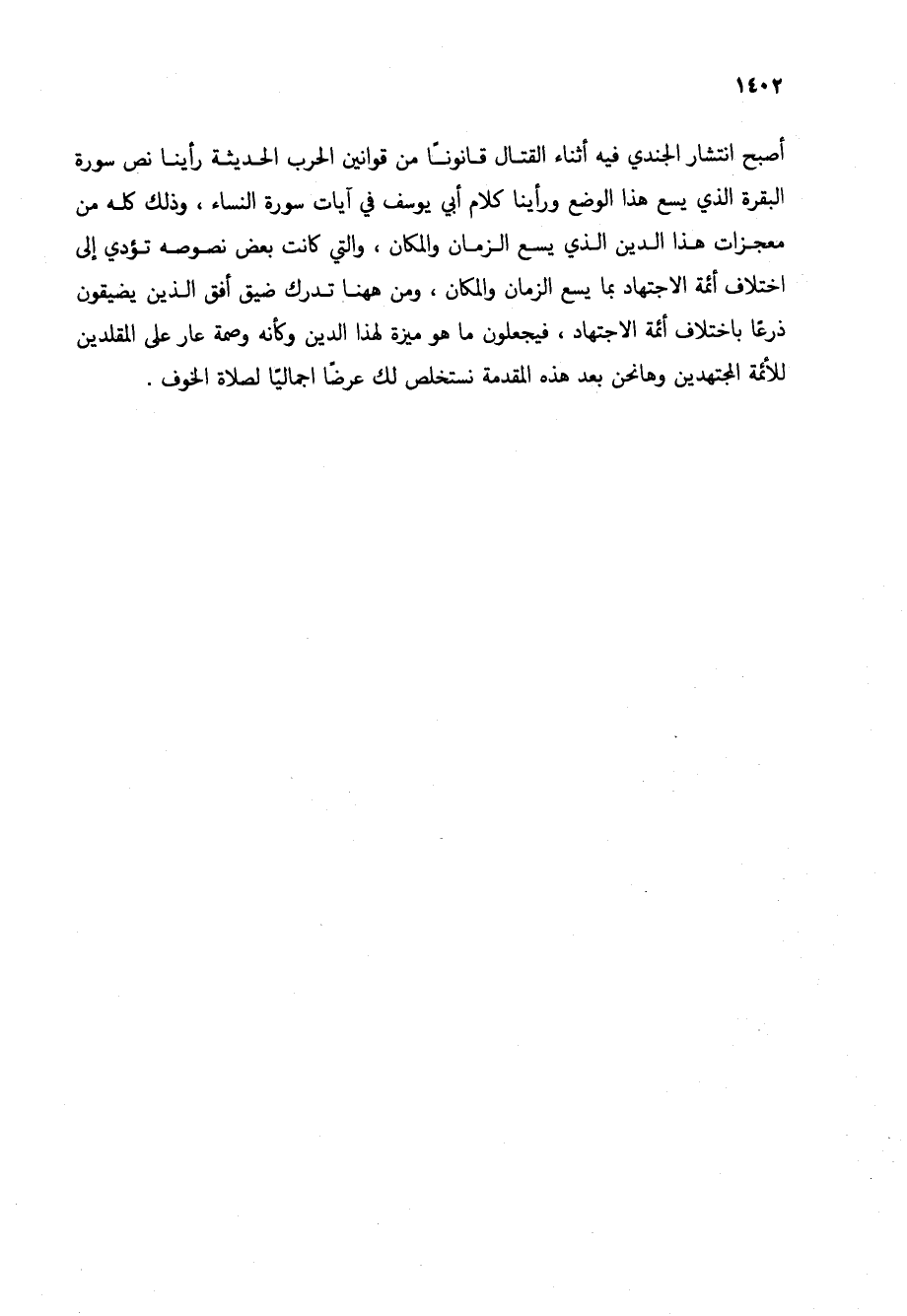 أصبح انتشار الجندي فيه أثناء القتال قانوناً من قوانين الحرب الحديثة رأينا نص سورة البقرة الذي يسع هذا الوضع ورأينا كلام أبي يوسف في آيات سورة النساء، وذلك كله من معجزات هذا الدين الذي يسع الزمان والمكان، والتي كانت بعض نصوصه تؤدي إلى اختلاف أئمة الاجتهاد بما يسع الزمان والمكان، ومن ههنا تدرك ضيق أفق الذين يضيقون ذرعاً باختلاف أئمة الاجتهاد، فيجعلون ما هو ميزة لهذا الدين وكأنه وصمة عار على المقلدين للأئمة المجتهدين وها نحن بعد هذه المقدمة نستخلص لك عرضاً إجمالياً لصلاة الخوف.