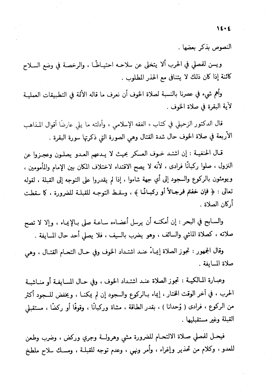 قال الدكتور الزحيلي في كتاب "الفقه الإسلامي" وأدلته ما يلي عارضاً أقوال المذاهب الأربعة في صلاة الخوف حال شدة القتال وهي الصورة التي ذكرتها سورة البقرة.