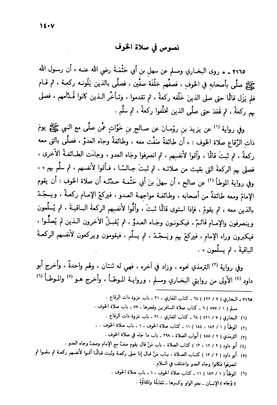 2165 - * روى البخاري ومسلم عن سهل بن أبي حثمة رضي الله عنه "أن رسول الله صلى الله عليه وسلم صلى بأصحابه في الخوف، فصفهم خلفه صفين، فصلى بالذين يلونه ركعة، ثم قام فلم يزل قائماً حتى صلى الذين خلفه ركعة، ثم تقدموا، وتأخر الذين كانوا قدامهم، فصلى بهم ركعة، ثم قعد حتى صلى الذين تخلفوا ركعة، ثم سلم.