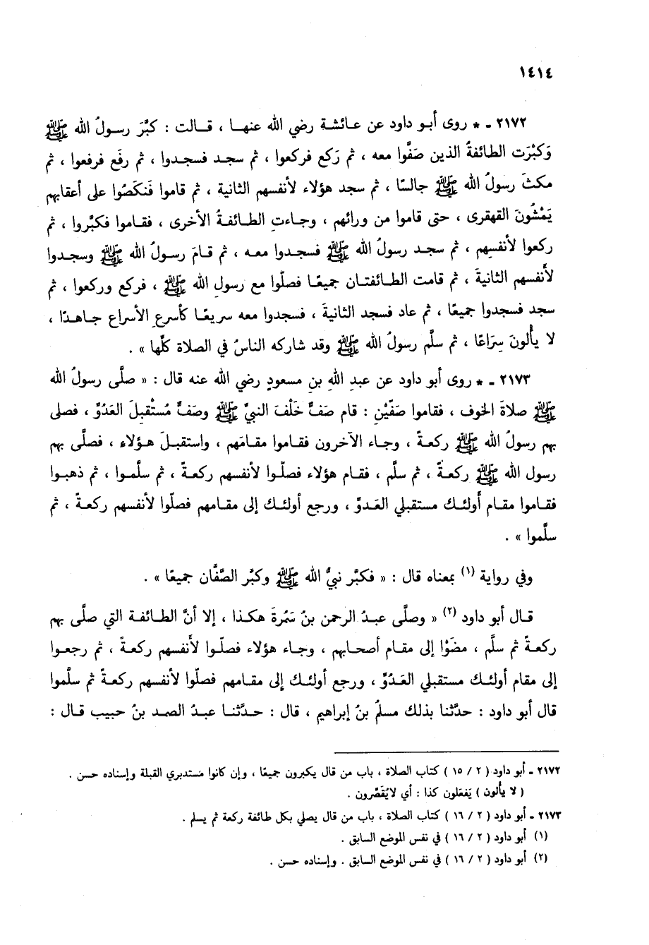 2173 - * روى أبو داود عن عبد الله بن مسعود رضي الله عنه قال: "صلى رسول الله صلى الله عليه وسلم صلاة الخوف، فقاموا صفين: قام صف خلف النبي صلى الله عليه وسلم وصف مستقبل العدو، فصلى بهم رسول الله صلى الله عليه وسلم ركعة، وجاء الآخرون فقاموا مقامهم، واستقبل هؤلاء، فصلى بهم رسول الله صلى الله عليه وسلم ركعة، ثم سلم، فقام هؤلاء فصلوا لأنفسهم ركعة، ثم سلموا، ثم ذهبوا فقاموا مقام أولئك مستقبلي العدو، ورجع أولئك إلى مقامهم فصلوا لأنفسهم ركعة، ثم سلموا".