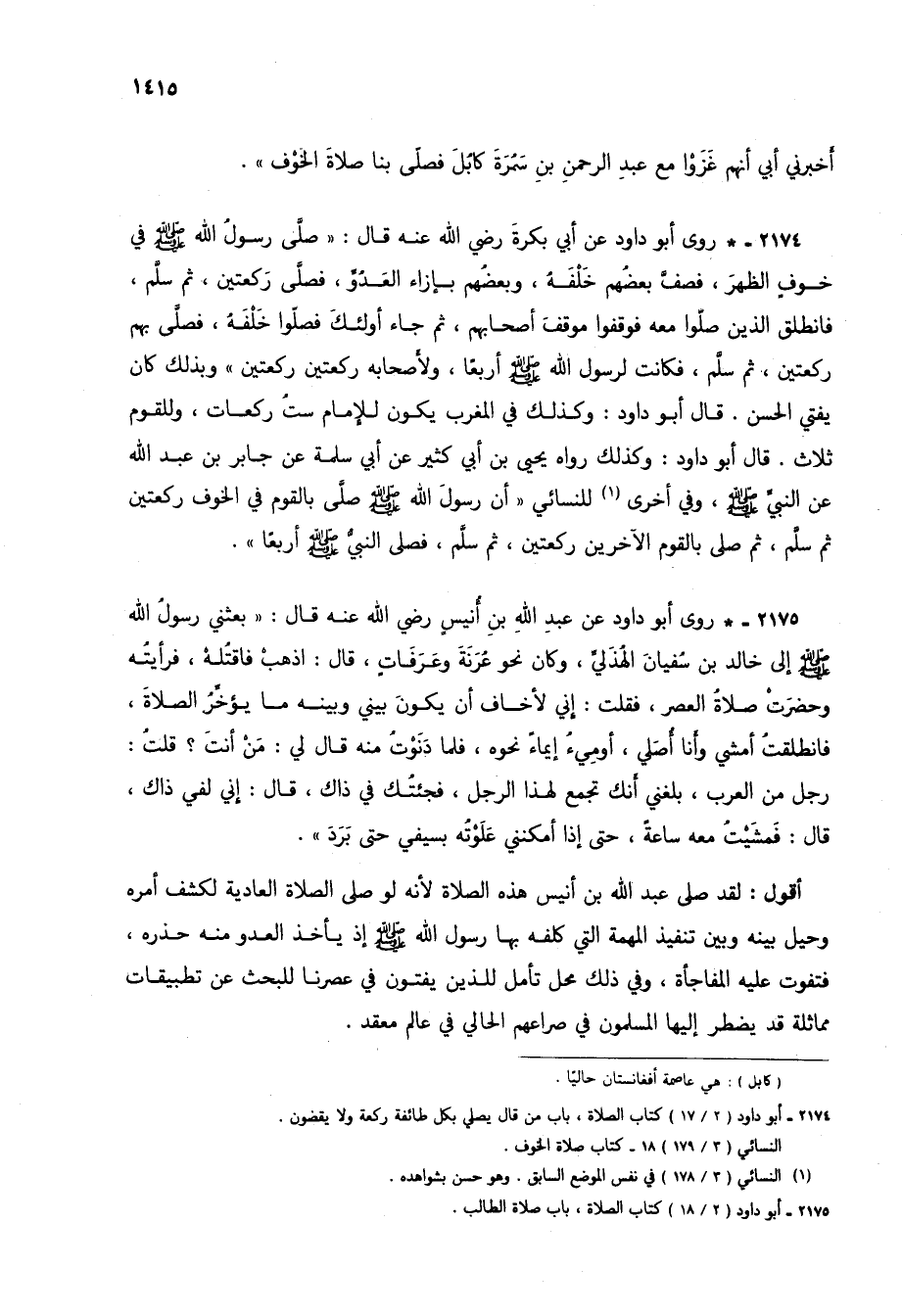 2175 - * روى أبو داود عن عبد الله بن أنيس رضي الله عنه قال: "بعثني رسول الله صلى الله عليه وسلم إلى خالد بن سفيان الهذلي، وكان نحو عرنة وعرفات، قال: اذهب فاقتله، فرأيته وحضرت صلاة العصر، فقلت: إني لأخاف أن يكون بيني وبينه ما يؤخر الصلاة، فانطلقت أمشي وأنا أصلي، أومئ إيماءً نحوه، فلما دنوت منه قال لي: من أنت؟ قلت: رجل من العرب، بلغني أنك تجمع لهذا الرجل، فجئتك في ذاك، قال: إني لفي ذاك، قال: فمشيت معه ساعة، حتى إذا أمكنني علوته بسيفي حتى برد".
