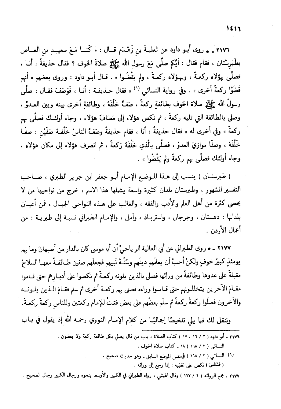 2177 - * روى الطبراني عن أبي العالية الرياحي أن أبا موسى كان بالدار من أصبهان وما بهم يومئذ كبير خوف ولكن أحب أن يعلمهم دينهم وسُنَّة نبيهم فجعلهم صفين طائفة معها السلاح مقبلة على عدوها وطائفة من ورائها فصلى بالذين يلونه ركعة ثم نكصوا على أدبارهم حتى قاموا مقام الآخرين يتخللونهم حتى قاموا وراءه فصلى بهم ركعة أخرى ثم سلم فقام الذين يلونه والآخرون فصلوا ركعة ركعة ثم سلم بعضهم على بعض فتمت للإمام ركعتين وللناس ركعة ركعة.
