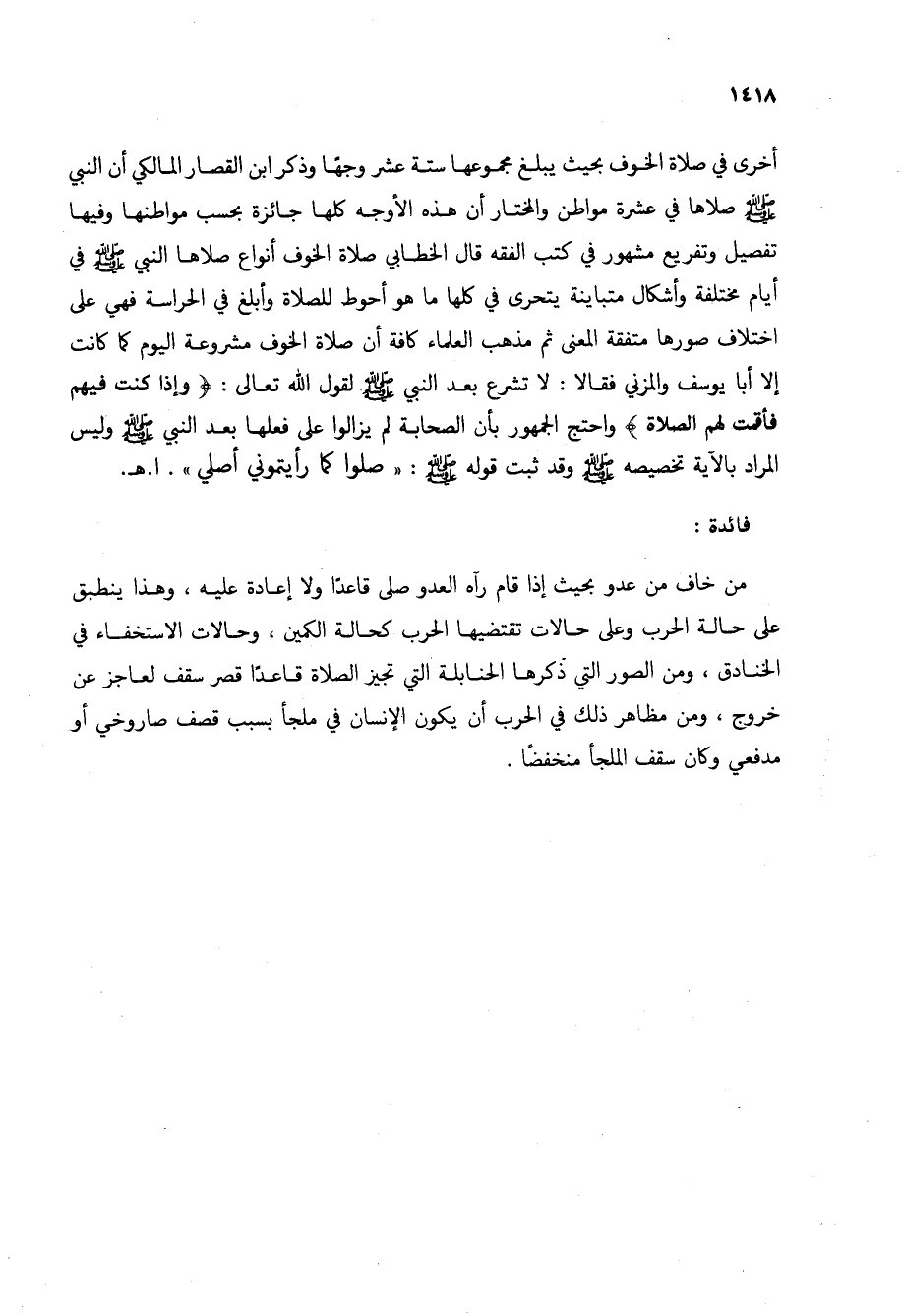 أخرى في صلاة الخوف بحيث يبلغ مجموعها ستة عشر وجهاً وذكر ابن القصار المالكي أن النبي صلى الله عليه وسلم صلاها في عشرة مواطن والمختار أن هذه الأوجه كلها جائزة بحسب مواطنها وفيها تفصيل وتفريع مشهور في كتب الفقه قال الخطابي صلاة الخوف أنواع صلاها النبي صلى الله عليه وسلم في أيام مختلفة وأشكال متباينة يتحرى في كلها ما هو أحوط للصلاة وأبلغ في الحراسة فهي على اختلاف صورها متفقة المعنى ثم مذهب العلماء كافة أن صلاة الخوف مشروعة اليوم كما كانت إلا أبا يوسف والمزني فقالا: لا تشرع بعد النبي صلى الله عليه وسلم لقول الله تعالى: {وَإِذَا كُنْتَ فِيهِمْ فَأَقَمْتَ لَهُمُ الصَّلَاةَ} واحتج الجمهور بأن الصحابة لم يزالوا على فعلها بعد النبي صلى الله عليه وسلم وليس المراد بالآية تخصيصه صلى الله عليه وسلم وقد ثبت قوله صلى الله عليه وسلم: "صلوا كما رأيتموني أصلي". ا. هـ.