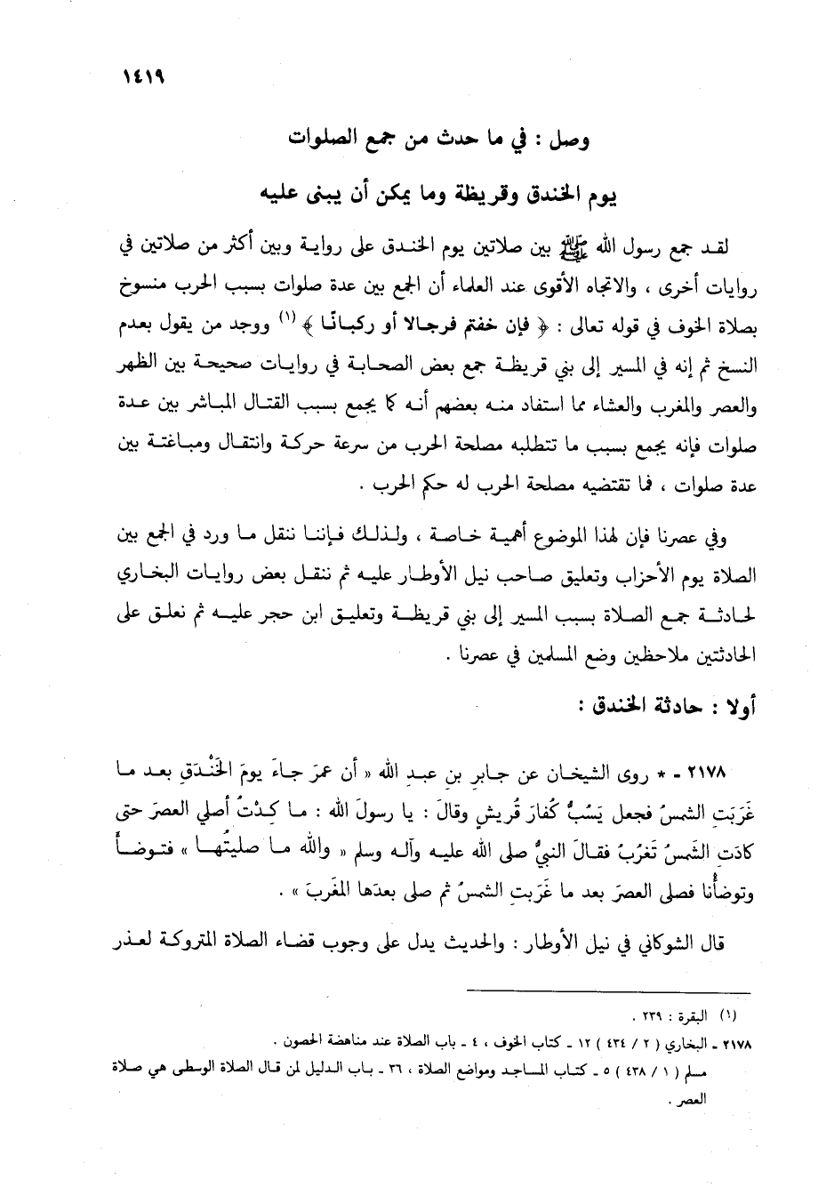 وفي عصرنا فإن لهذا الموضوع أهمية خاصة، ولذلك فإننا ننقل ما ورد في الجمع بين الصلاة يوم الأحزاب وتعليق صاحب نيل الأوطار عليه ثم ننقل بعض روايات البخاري لحادثة جمع الصلاة بسبب المسير إلى بني قريظة وتعليق ابن حجر عليه ثم نعلق على الحادثتين ملاحظين وضع المسلمين في عصرنا.