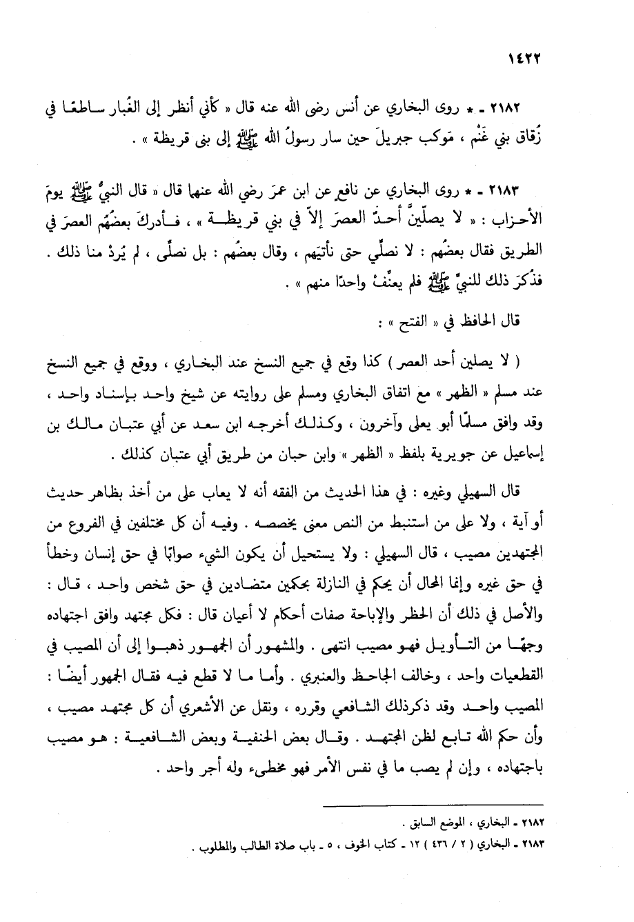 2183 - * روى البخاري عن نافع عن ابن عمر رضي الله عنهما قال "قال النبي صلى الله عليه وسلم يوم الأحزاب: "لا يصلين أحد العصر إلا في بني قريظة"، فأدرك بعضهم العصر في الطريق فقال بعضهم: لا نصلي حتى نأتيهم، وقال بعضهم: بل نصلي، لم يرد منا ذلك. فذكر ذلك للنبي صلى الله عليه وسلم فلم يعنف واحداً منهم".