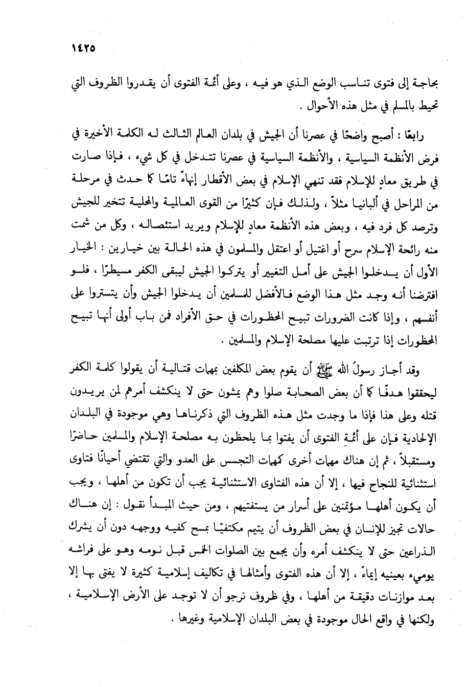 وقد أجاز رسول الله صلى الله عليه وسلم أن يقوم بعض المكلفين بمهمات قتالية أن يقولوا كلمة الكفر ليحققوا هدفاً كما أن بعض الصحابة صلوا وهم يمشون حتى لا ينكشف أمرهم لمن يريدون قتله وعلى هذا فإذا ما وجدت مثل هذه الظروف التي ذكرناها وهي موجودة في البلدان الإلحادية فإن على أئمة الفتوى أن يفتوا بما يلحظون به مصلحة الإسلام والمسلمين حاضراً ومستقبلاً، ثم إن هناك مهمات أخرى كمهمات التجسس على العدو والتي تقتضي أحياناً فتاوى استثنائية للنجاح فيها، إلا أن هذه الفتاوى الاستثنائية يجب أن تكون من أهلها، ويجب أن يكون أهلها مؤتمنين على أسرار من يستفتيهم، ومن حيث المبدأ نقول: إن هناك حالات تجيز للإنسان ي بعض الظروف أن يتيمم مكتفياً بمسح كفيه ووجهه دون أن يشرك الذراعين حتى لا ينكشف أمره وأن يجمع بين الصلوات الخمس قبل نومه وهو على فراشه يومئ بعينيه إيماءً، إلا أن هذه الفتوى وأمثالها في تكاليف إسلامية كثيرة لا يفتى بها إلا بعد موازنات دقيقة من أهلها، وفي ظروف نرجو أن لا توجد على الأرض الإسلامية، ولكنها في واقع الحال موجودة في بعض البلدان الإسلامية وغيرها.