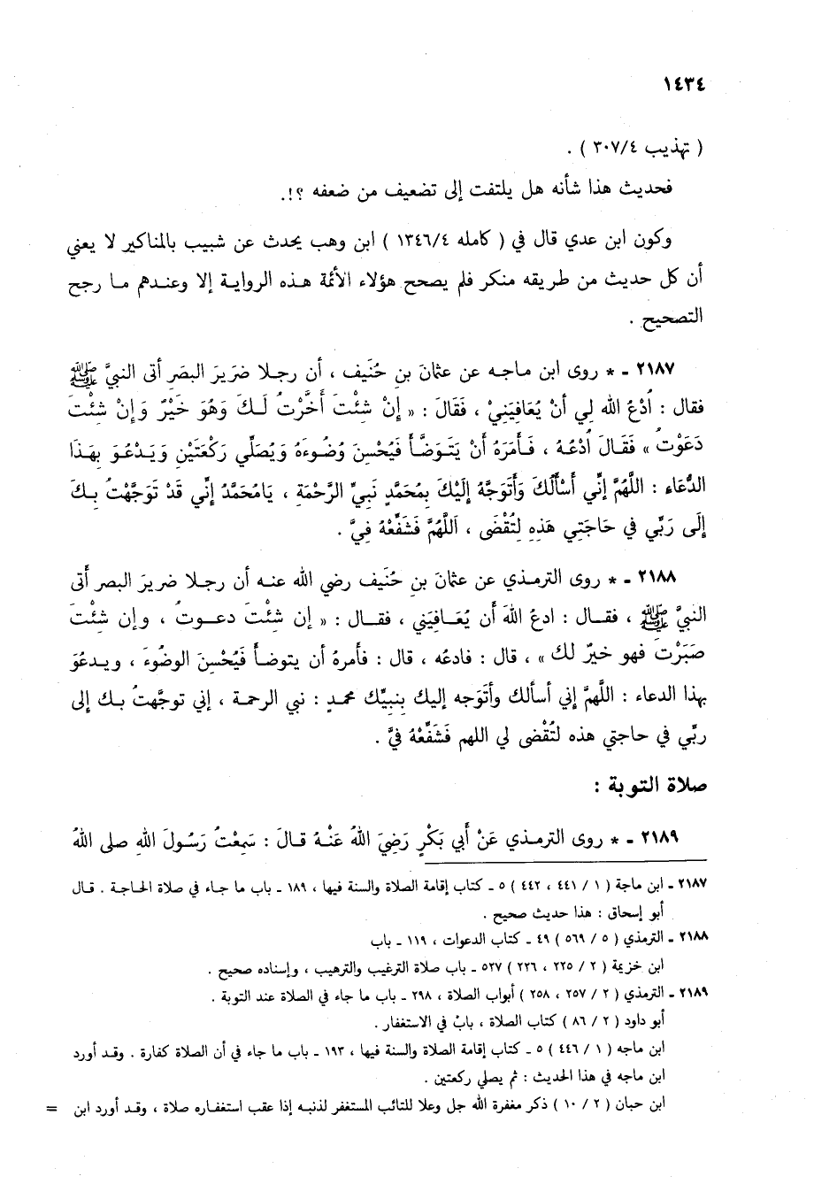2188 - * روى الترمذي عن عثمان بن حنيف رضي الله عنه أن رجلاً ضرير البصر أتى النبي صلى الله عليه وسلم، فقال: ادع الله أن يعافيني، فقال: "إن شئت دعوت، وإن شئت صبرت فهو خير لك"، قال: فادعه، قال: فأمره أن يتوضأ فيحسن الوضوء، ويدعو بهذا الدعاء: اللهم إني أسألك وأتوجه إليك بنبيك محمد: نبي الرحمة، إني توجهت بك إلى ربي في حاجتي هذه لتقضى لي اللهم فشفعه في.