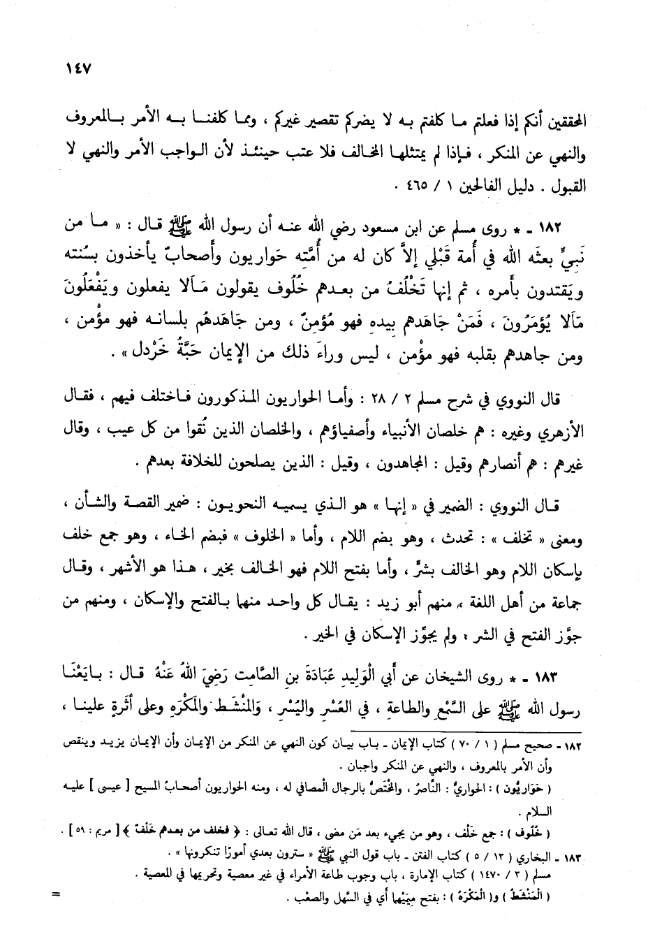 182 - * روى مسلم عن ابن مسعود رضي الله عنه أن رسول الله صلى الله عليه وسلم قال: "ما من نبي بعثه الله في أمة قبلي إلا كان له من أمته حواريون وأصحابٌ يأخذون بسنته ويقتدون بأمره، ثم إنها تخلف من بعدهم خلوف يقولون ما لا يفعلون ويفعلون ما لا يؤمرون، فمن جاهدهم بيده فهو مؤمنٌ، ومن جاهدهم بلسانه فهو مؤمن، ومن جاهدهم بقلبه فهو مؤمن، ليس وراء ذلك من الإيمان حبةُ خردل".