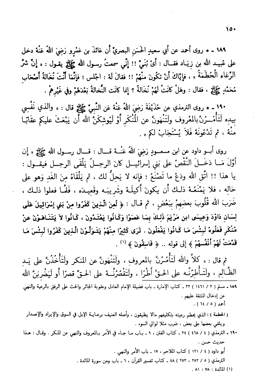 190 - * روى الترمذي عن حُذيفة رضي الله عنه عن النبي صلى الله عليه وسلم قال: "والذي نفسي بيده لتأمرن بالمعروف ولتنهون عن المنكر أو ليُوشكنَّ الله أن يبعث عليكم عقاباً منه، ثم تدعونه فلا يُستجاب لكم".