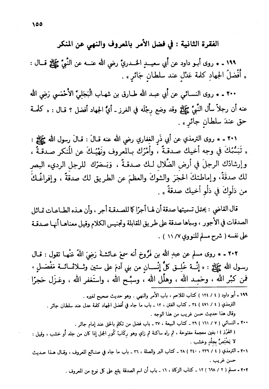 201 - * روى الترمذي عن أبي ذر الغفاري رضي الله عنه قال: قال رسول الله صلى الله عليه وسلم: "تبَسُّمُك في وجه أخيك صدقةٌ، وأمرُك بالمعروف ونهيك عن المنكر صدقة، وإرشادك الرجل في أرض الضلال لك صدقة، وبصرك للرجل الرديء البصر لك صدقة، وإماطتك الحجر والشوك والعظم عن الطريق لك صدقة، وإفراغُك من دلوك في دلو أخيك صدقةٌ".