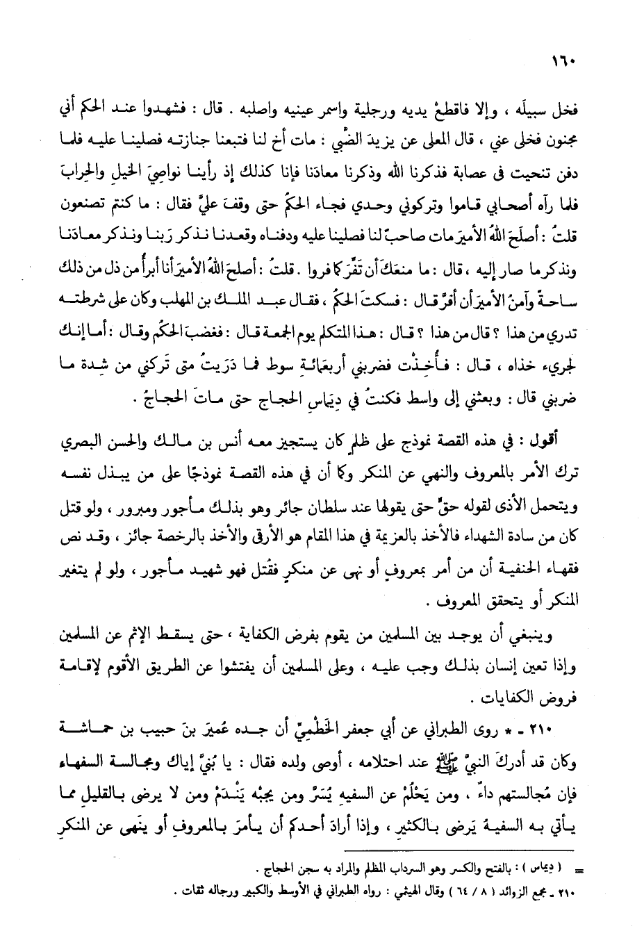 أقول: في هذه القصة نموذج على ظلمٍ كان يستجيز معه أنس بن مالك والحسن البصري ترك الأمر بالمعروف والنهي عن المنكر وكما أن في هذه القصة نموذجاً على من يبذل نفسه ويتحمل الأذى لقوله حقٍّ حتى يقولها عند سلطان جائر وهو بذلك مأجور ومبرور، ولو قتل كان من سادة الشهداء فالأخذ بالعزيمة في ذا المقام هو الأرقى والأخذ بالرخصة جائز، وقد نص فقهاء الحنفية أن من أمر بمعروفٍ أو نهى عن منكرٍ فقُتل فهو شهيد مأجور، ولو لم يتغير المنكر أو يتحقق المعروف.