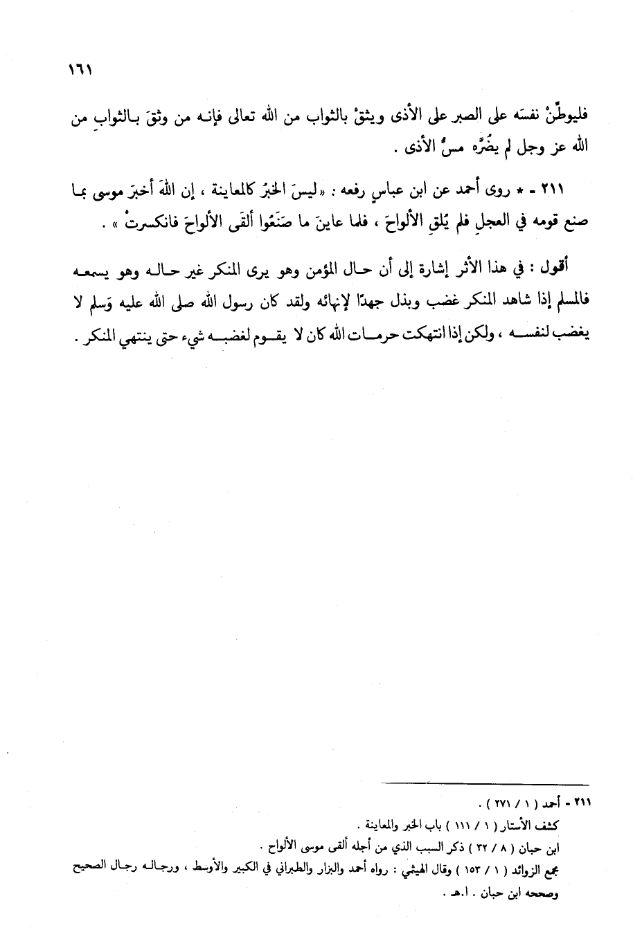 211 - * روى أحمد على ابن عباس رفعه: "ليس الخبرُ كالمعاينة، إن الله أخبر موسى بما صنع قومه في العجل فلم يُلقِ الألواحَ، فلما عاين ما صنعوا ألقى الألواح فانكسرتْ".