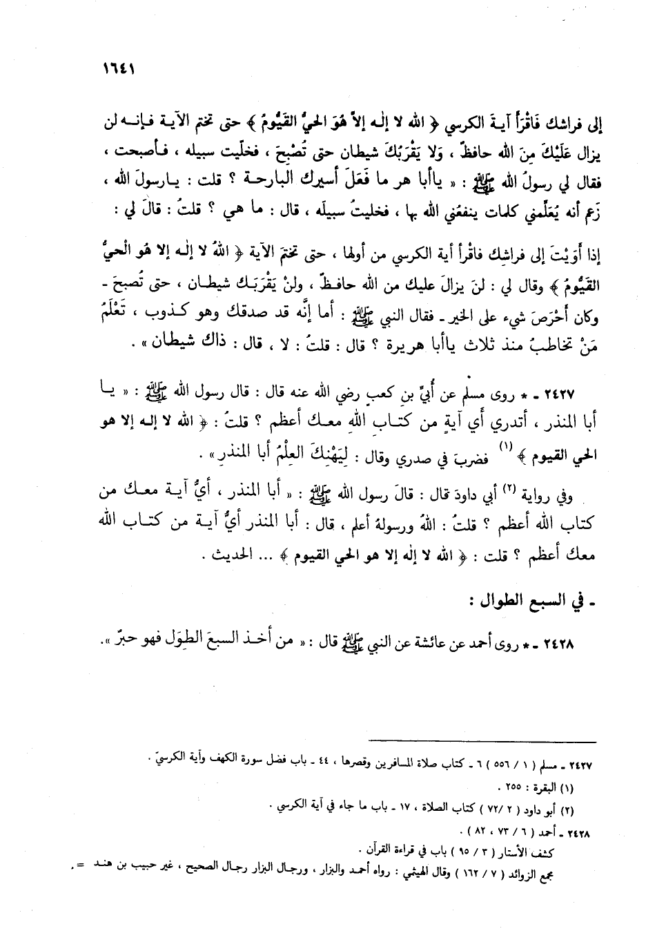 2427 - * روى مسلم عن أُبيِّ بن كعب رضي الله عنه قال: قال رسول الله صلى الله عليه وسلم: "يا أبا المنذر، أتدري أي آيةٍ من كتاب الله معك أعظم؟ قلت: {اللَّهُ لَا إِلَهَ إِلَّا هُوَ الْحَيُّ الْقَيُّومُ} (1) فضرب في صدري وقال: ليهنك العِلْمُ أبا المنذر".