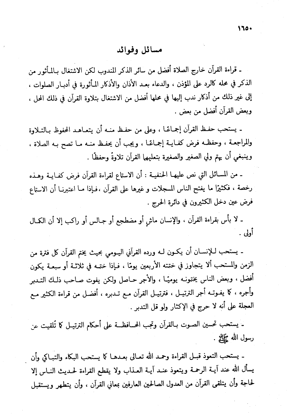 - قراءة القرآن خارج الصلاة أفضل من سائر الذكر المندوب لكن الاشتغال بالمأثور من الذكر في محله كالرد على المؤذن، والدعاء بعد الأذان والأذكار المأثورة في أدبار الصلوات، إلى غير ذلك من أذكار ندب إليها في محلها أفضل من الاشتغال بتلاوة القرآن في ذلك المحل، وبعض القرآن أفضل من بعض.