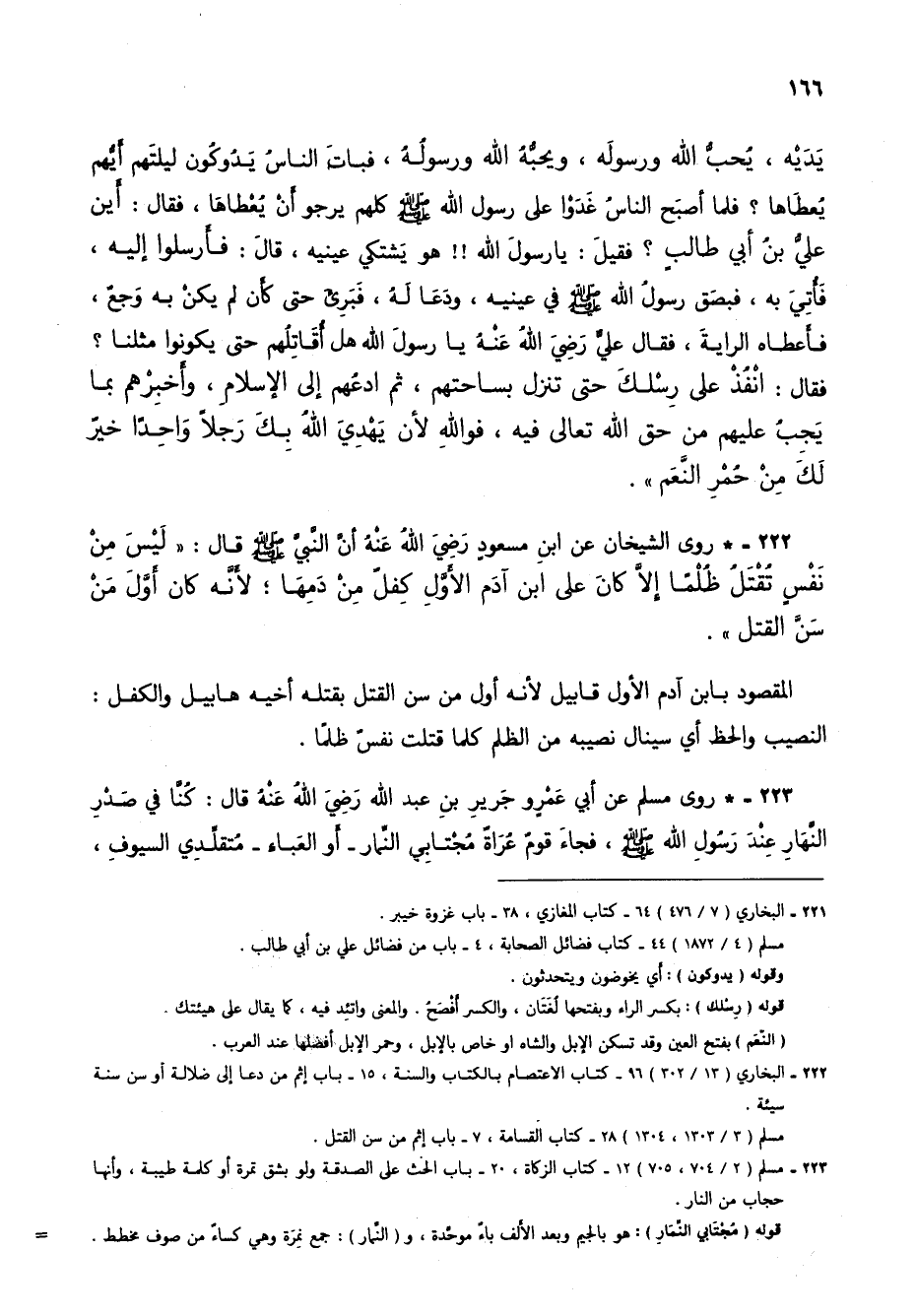 222 - * روى الشيخان عن ابن مسعود رضي الله عنه أن النبي صلى الله عليه وسلم قال: "ليس من نفسٍ تقتل ظلماً إلا كان على ابن آدم الأول كِفلٌ من دمها؛ لأنه كان أول من سن القتل".