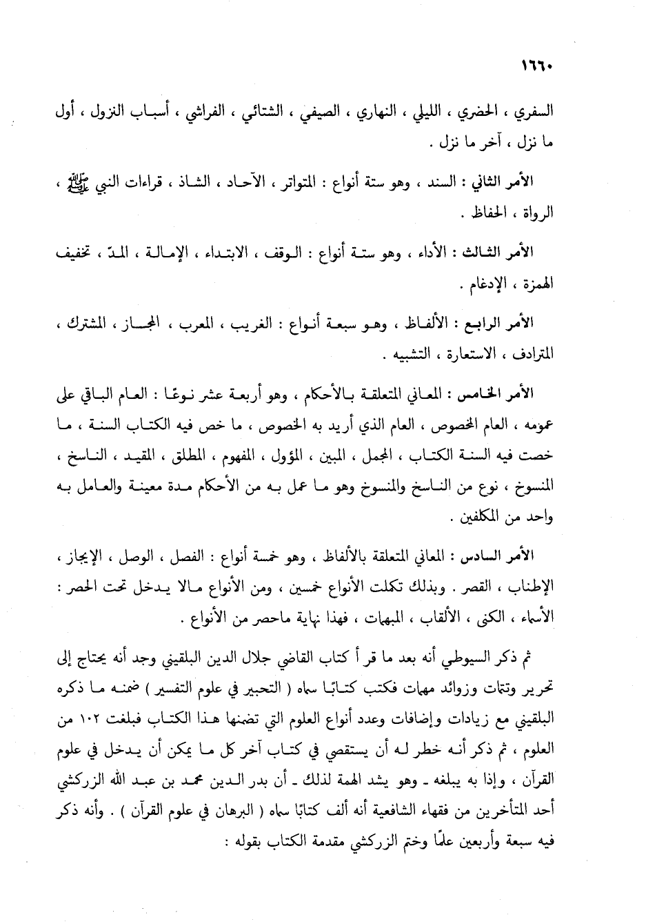 السفري، الحضري، الليلي، النهاري، الصيفي، الشتائي، الفراشي، أسباب النزول، أول ما نزل، آخر ما نزل.