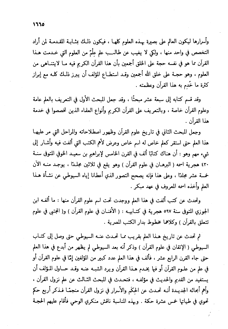وأسرارها ليكون العالم على بصيرة بهذه العلوم كلها، فيكون ذلك بمثابة المقدمة لمن أراد التخصص في واحد منها، ولكي لا يغيب عن طالب علم عِلْمٌ من العلوم التي خدمت هذا القرآن مما هو في نفسه حجة على الخلق أجمعين بأن هذا القرآن الكريم فيه ما لا يتناهى من العلوم، وهو حجة على خلق الله أجمعين وقد استطاع المؤلف أن يبرز ذلك كله مع إبراز كثرة ما خُدِم به هذا القرآن وعظمته.