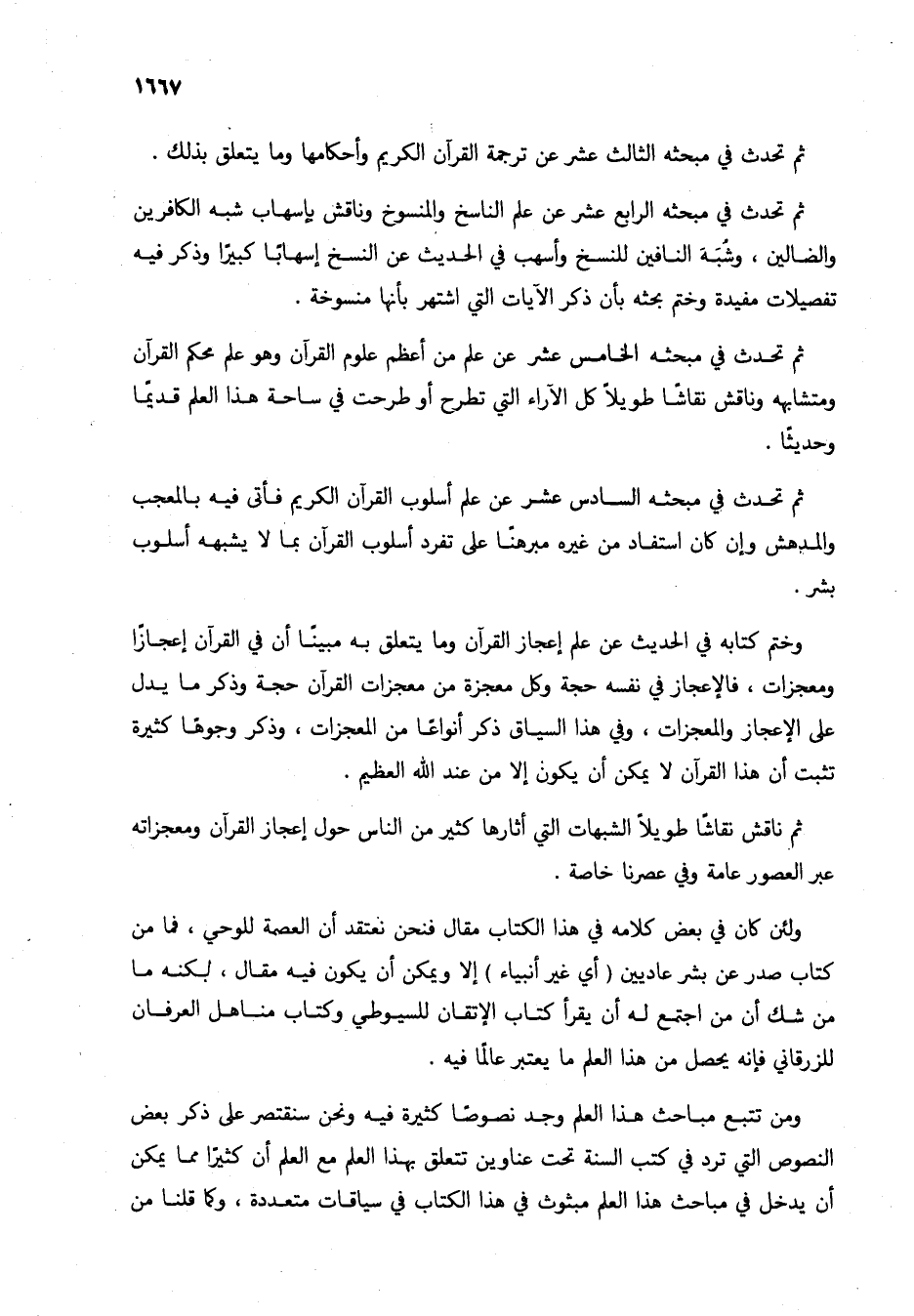 ولئن كان في بعض كلامه في هذا الكتاب مقال فنحن نعتقد أن العصمة للوحي، فما من كتاب صدر عن بشر عاديين (أي غير أنبياء) إلا ويمكن أن يكون فيه مقال، لكنه ما من شك أن من اجتمع له أن يقرأ كتاب الإتقان للسيوطي وكتاب مناهل العرفان للزرقاني فإنه يحصل من هذا العلم ما يعتبر عالماً فيه.