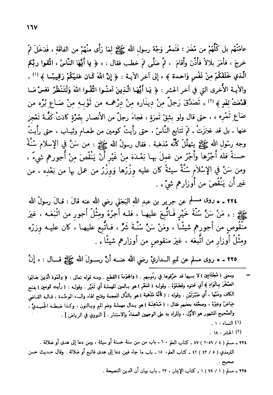 224 - * روى مسلم عن جرير بن عبد الله البجلي رضي الله عنه قال: قال رسول الله صلى الله عليه وسلم: "من سن سُنة خيرٍ فاتُّبع عليها، فله أجره ومثل أجور من اتبعه، غير منقوصٍ من أجورهم شيئاً، ومن سن سنة شرٍّ، فاتُّبع عليها، كان عليه وزره ومثل أوزار من اتبعه، غير منقوصٍ من أوزارهم شيئاً.