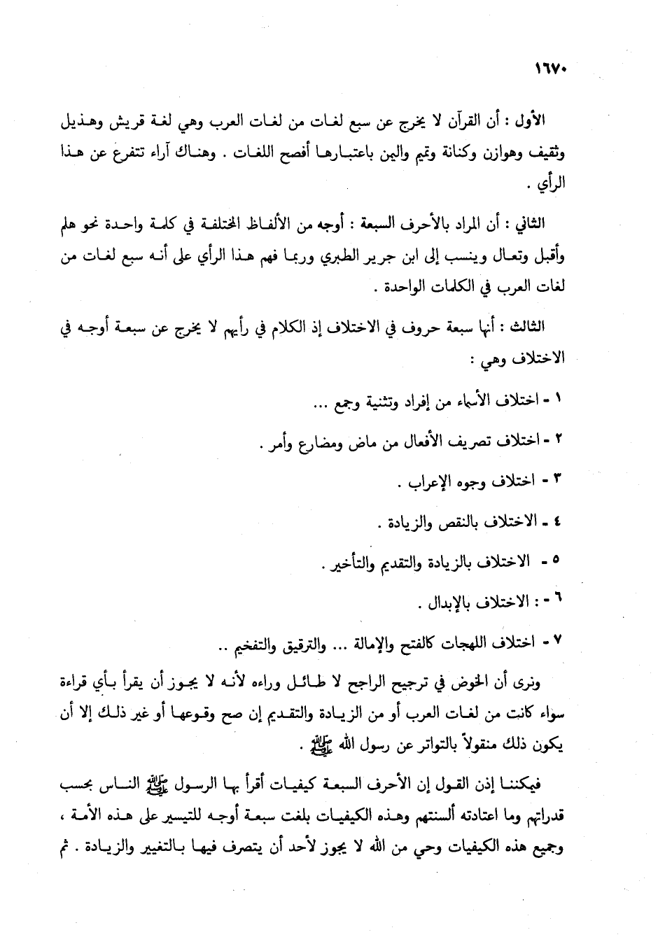 الثالث: أنها سبعة حروف في الاختلاف إذ الكلام في رأيهم لا يخرج عن سبعة أوجه في الاختلاف وهي: